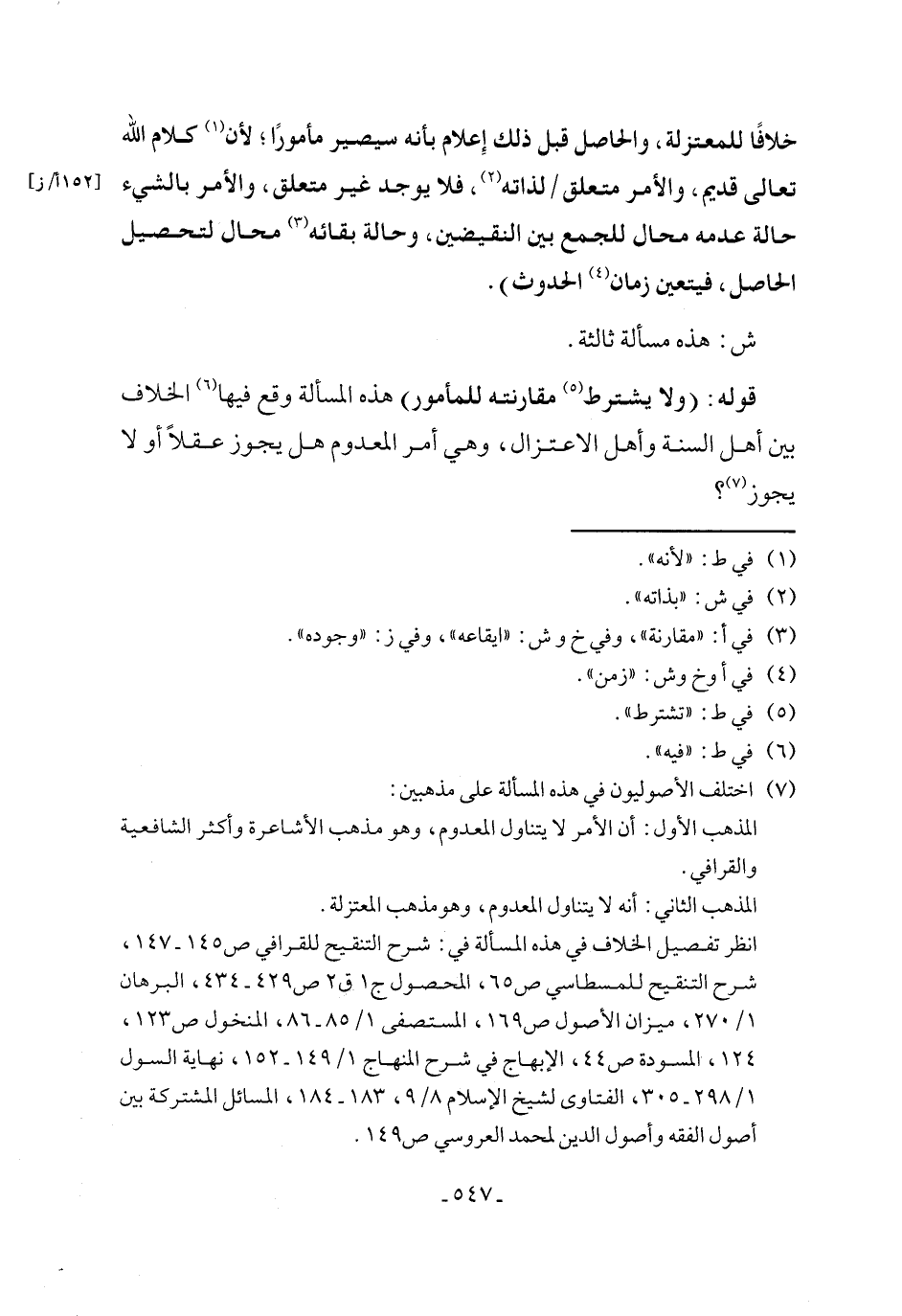 قوله: (ولا يشترط (٥) مقارنته للمأمور) هذه المسألة وقع فيها (٦) الخلاف بين أهل السنة وأهل الاعتزال، وهي أمر المعدوم هل يجوز عقلاً أو لا يجوز (٧)؟