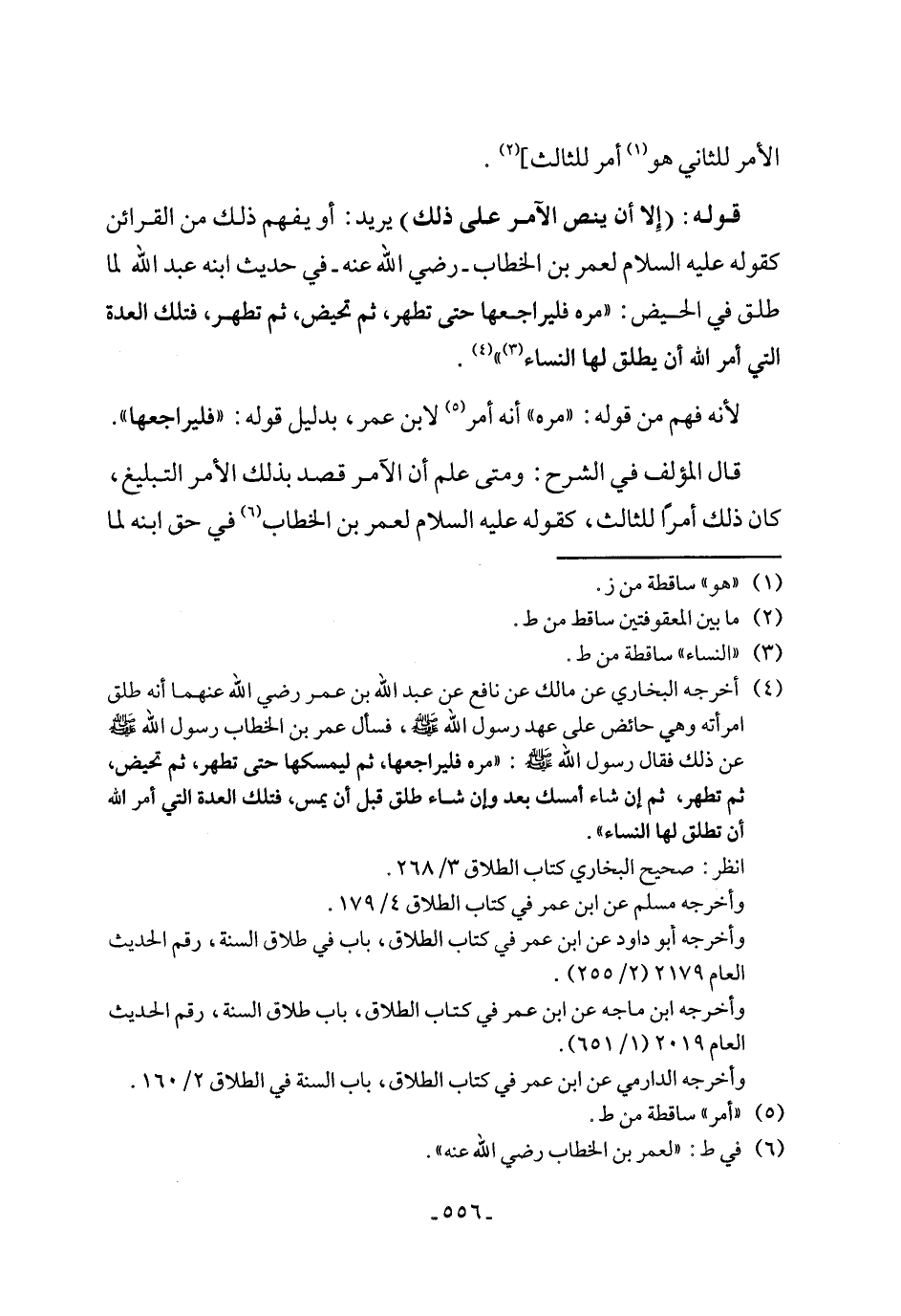 (٤) أخرجه البخاري عن مالك عن نافع عن عبد الله بن عمر رضي الله عنهما أنه طلق امرأته وهي حائض على عهد رسول الله - صلى الله عليه وسلم -، فسأل عمر بن الخطاب رسول الله - صلى الله عليه وسلم - عن ذلك فقال رسول الله - صلى الله عليه وسلم -: "مره فليراجعها، ثم ليمسكها حتى تطهر، ثم تحيض، ثم تطهر، ثم إن شاء أمسك بعد وإن شاء طلق قبل أن يمس، فتلك العدة التي أمر الله أن تطلق لها النساء".