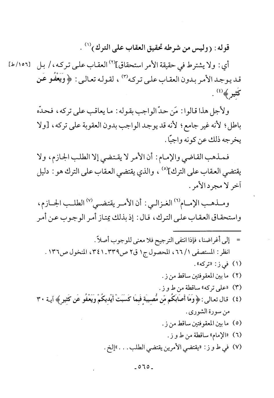 أي: ولا يشترط في حقيقة الأمر استحقاق] (٢) العقاب على تركه، بل قد يوجد الأمر بدون العقاب على تركه (٣)، لقوله تعالى: {وَيَعْفُو عَن كَثِيرٍ} (٤).