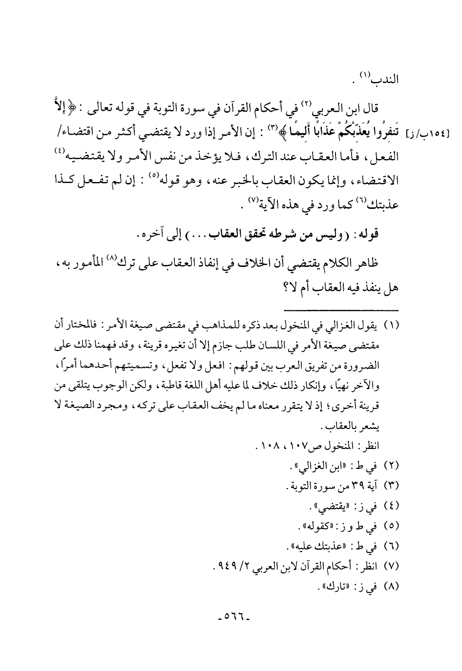 قال ابن العربي (٢) في أحكام القرآن في سورة التوبة في قوله تعالى: {إِلَّا تَنْفِرُوا يُعَذِّبْكُمْ عَذَابًا أَلِيمًا} (٣): إن الأمر إذا ورد لا يقتضي أكثر من اقتضاء الفعل، فأما العقاب عند الترك، فلا يؤخذ من نفس الأمر ولا يقتضيه (٤) الاقتضاء، وإنما يكون العقاب بالخبر عنه، وهو قوله (٥): إن لم تفعل كذا عذبتك (٦) كما ورد في هذه الآية (٧).
