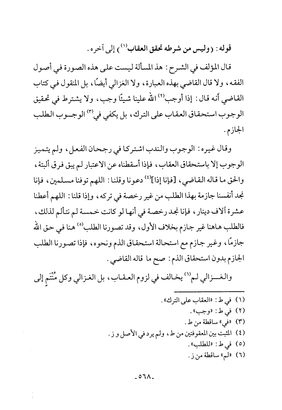 قال المؤلف في الشرح: هذ المسألة ليست على هذه الصورة في أصول الفقه، ولا قال القاضي بهذه العبارة، ولا الغزالي أيضًا، بل المنقول في كتاب القاضي أنه قال: إذا أوجب (٢) الله علينا شيئًا وجب، ولا يشترط في تحقيق الوجوب استحقاق العقاب على الترك، بل يكفي في (٣) الوجوب الطلب الجازم.