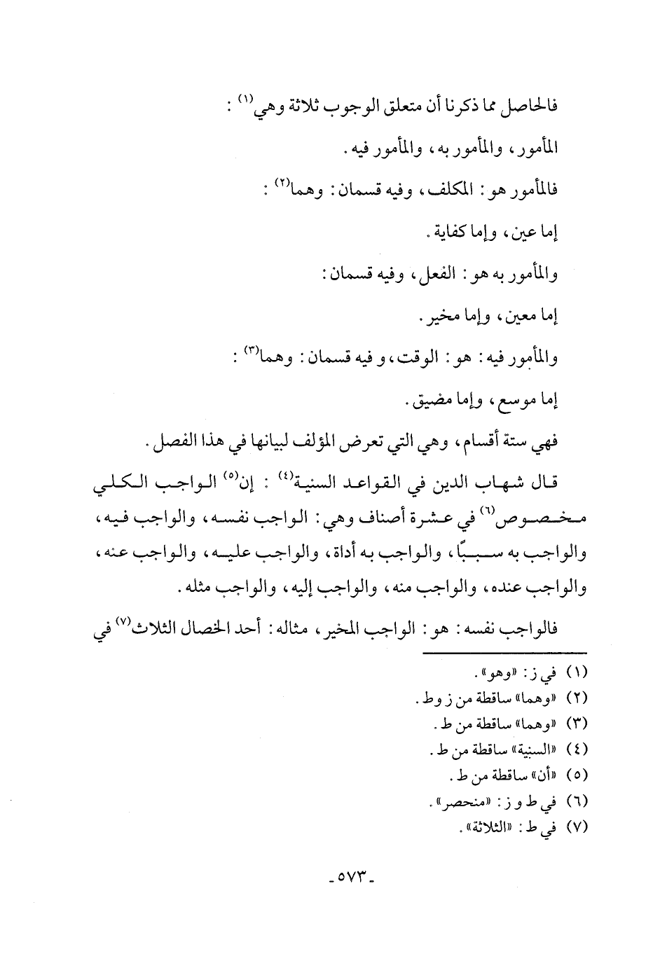 قال شهاب الدين في القواعد السنية (٤): إن (٥) الواجب الكلي مخصوص (٦) في عشرة أصناف وهي: الواجب نفسه، والواجب فيه، والواجب به سببًا، والواجب به أداة، والواجب عليه، والواجب عنه، والواجب عنده, والواجب منه، والواجب إليه، والواجب مثله.