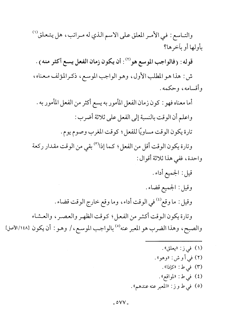 وتارة يكون الوقت أكثر من الفعل؛ كوقت الظهر والعصر، والعشاء والصبح، وهذا الضرب هو المعبر عنه (٥) بالواجب الموسع، وهو: أن يكون