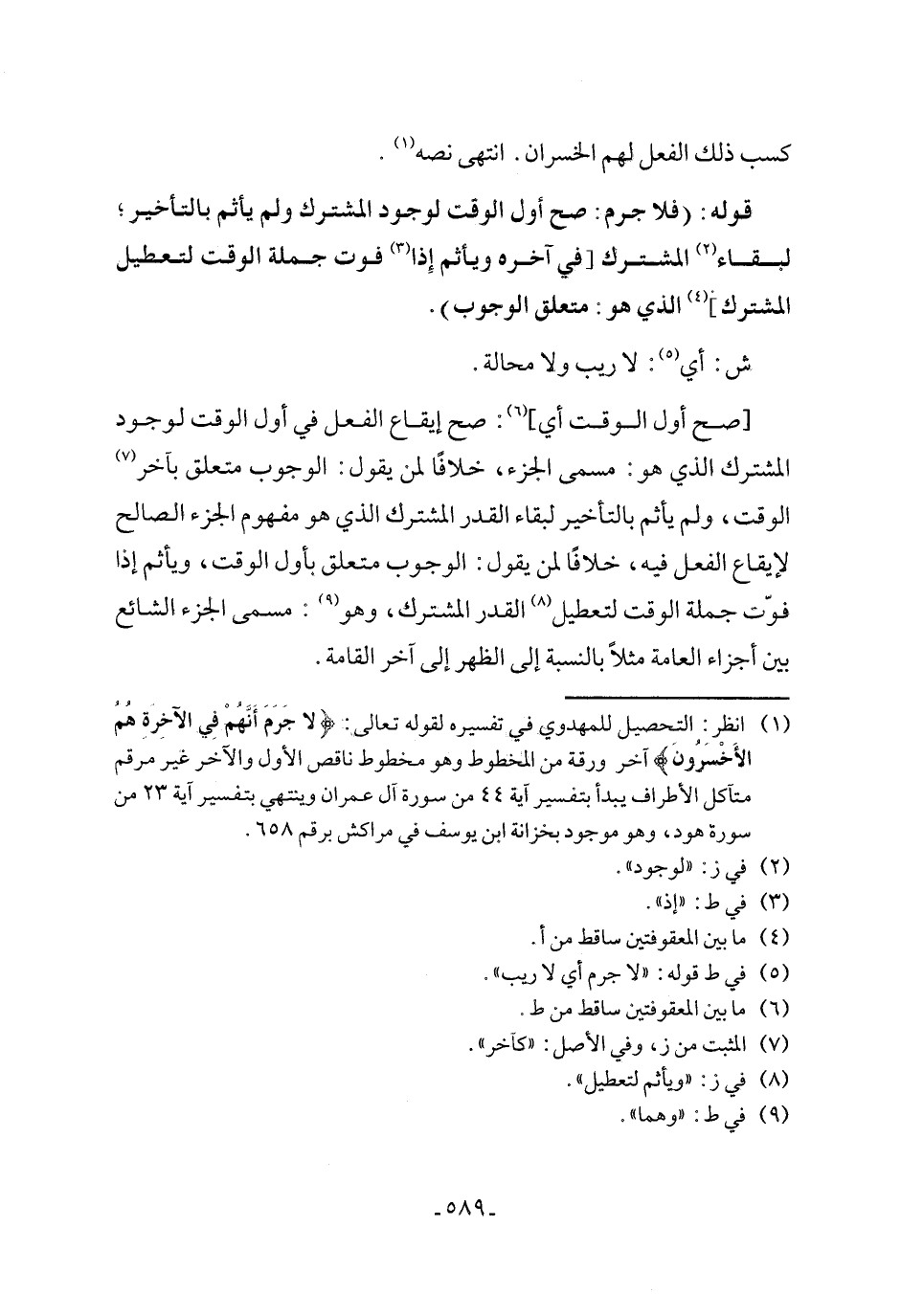قوله: (فلا جرم: صح أول الوقت لوجود المشترك ولم يأثم بالتأخير؛ لبقاء (٢) المشترك [في آخره ويأثم إِذا (٣) فوت جملة الوقت لتعطيل المشترك] (٤) الذي هو: متعلق الوجوب).