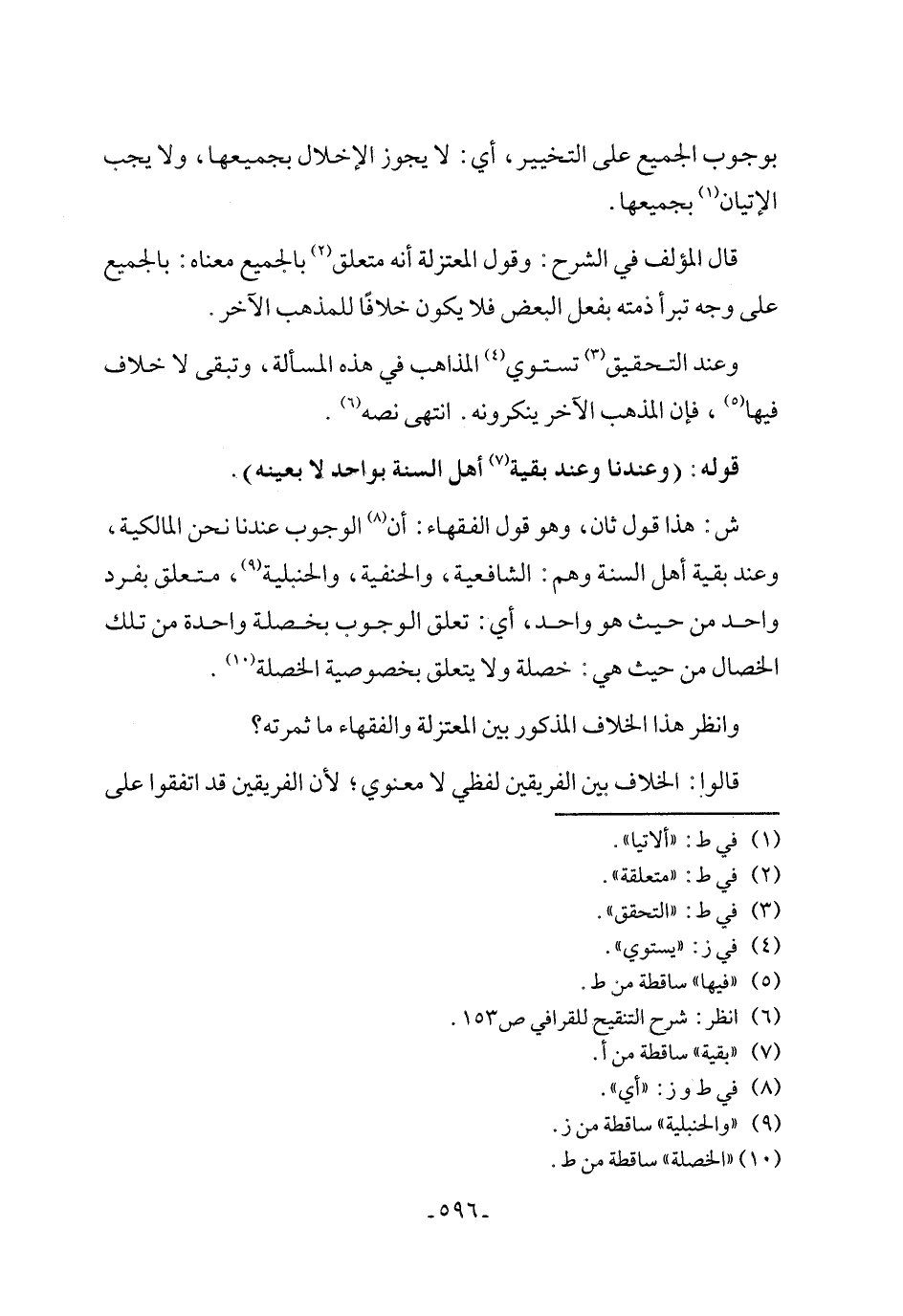 ش: هذا قول ثان، وهو قول الفقهاء: أن (٨) الوجوب عندنا نحن المالكية، وعند بقية أهل السنة وهم، الشافعية، والحنفية، والحنبلية (٩)، متعلق بفرد واحد من حيث هو واحد، أي. تعلق الوجوب بخصلة واحدة من تلك الخصال من حيث هي: خصلة ولا يتعلق بخصوصية الخصلة (١٠).