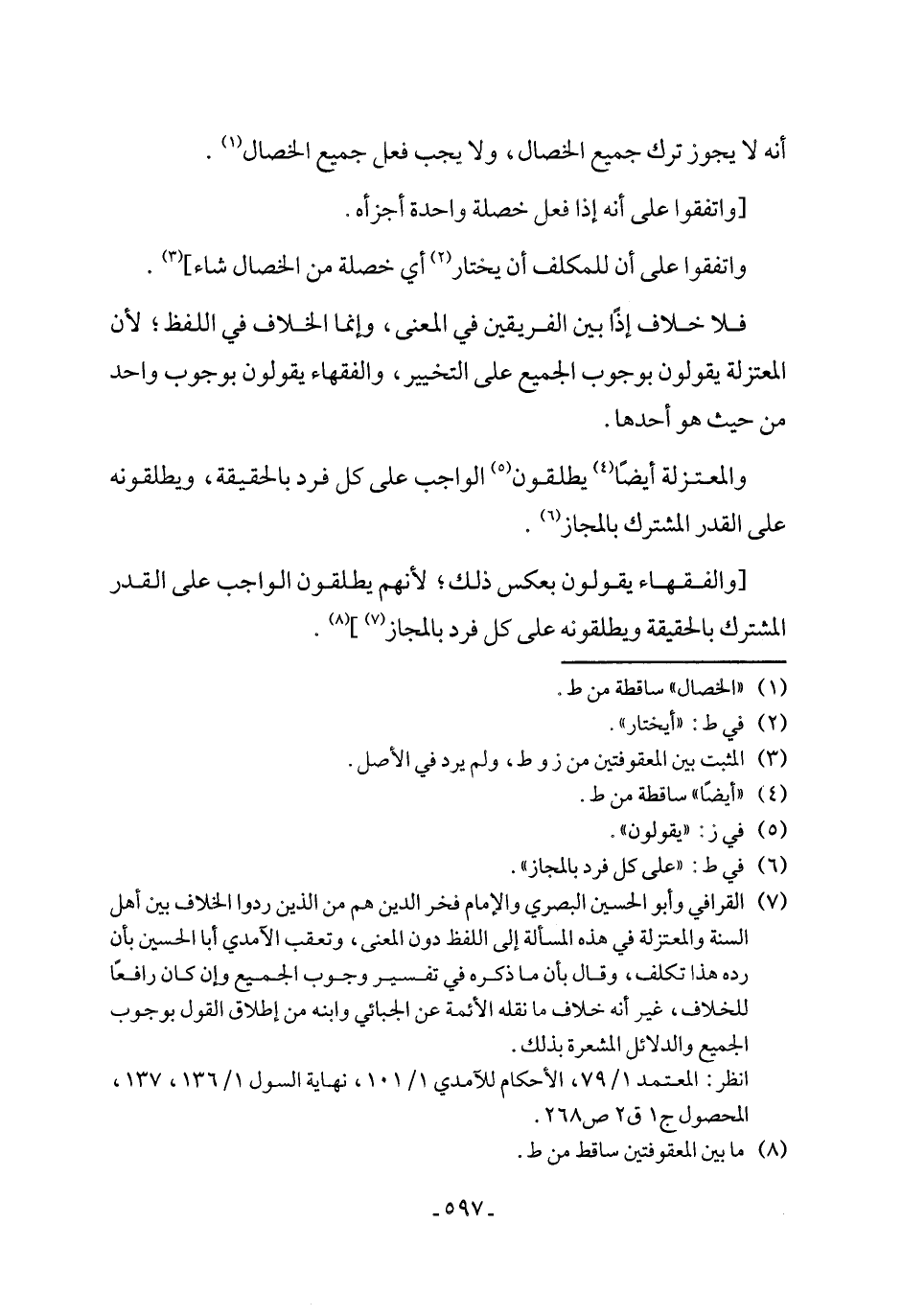 (٧) القرافي وأبو الحسين البصري والإمام فخر الدين هم من الذين ردوا الخلاف بين أهل السنة والمعتزلة في هذه المسألة إلى اللفظ دون المعنى، وتعقب الآمدي أبا الحسين بأن رده هذا تكلف، وقال بأن ما ذكره في تفسير وجوب الجميع وإن كان رافعًا للخلاف، غير أنه خلاف ما نقله الأئمة عن الجبائي وابنه من إطلاق القول بوجوب الجميع والدلائل المشعرة بذلك.