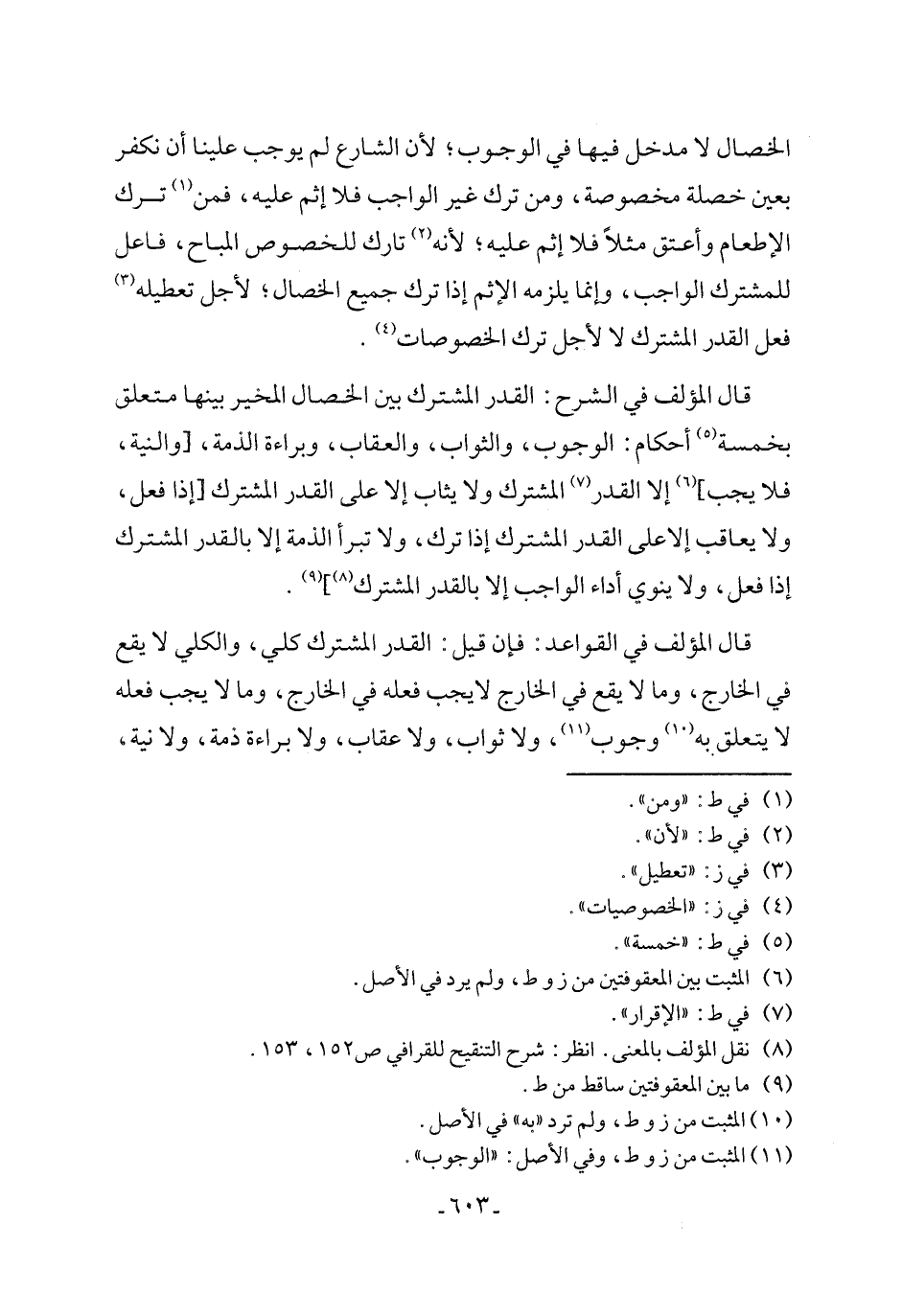 قال المؤلف في القواعد: فإن قيل: القدر المشترك كلي، والكلي لا يقع في الخارج، وما لا يقع في الخارج لا يجب فعله في الخارج، وما لا يجب فعله لا يتعلق به (١٠) وجوب (١١)، ولا ثواب، ولا عقاب، ولا براءة ذمة، ولا نية،