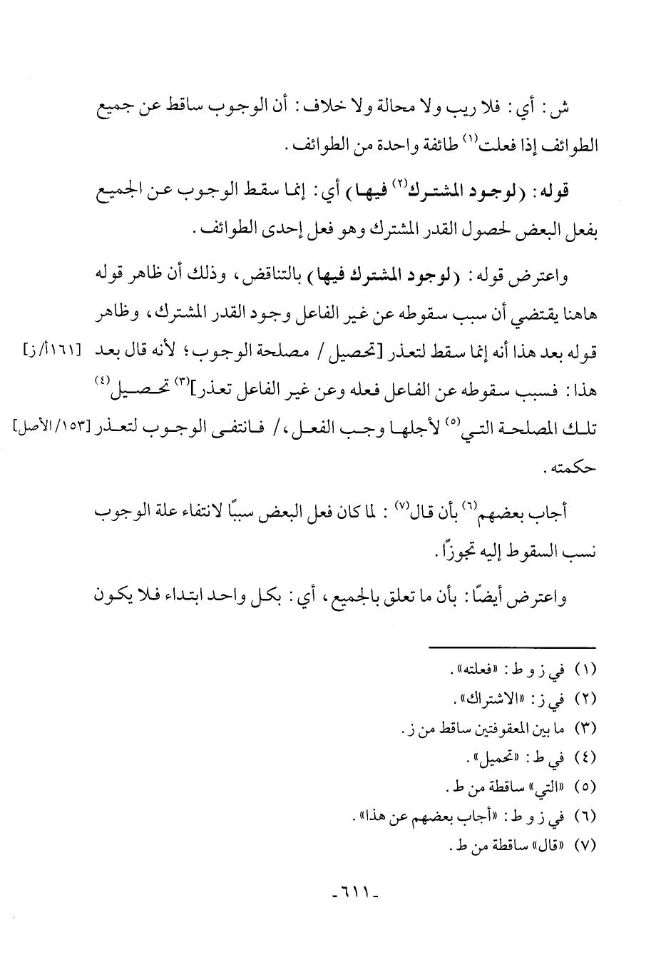 واعترض قوله: (لوجود المشترك فيها) بالتناقض، وذلك أن ظاهر قوله ها هنا يقتضي أن سبب سقوطه عن غير الفاعل وجود القدر المشترك، وظاهر قوله بعد هذا أنه إنما سقط لتعذر [تحصيل مصلحة الوجوب؛ لأنه قال بعد هذا: فسبب سقوطه عن الفاعل فعله وعن غير الفاعل تعذر] (٣) تحصيل (٤) تلك المصلحة التي (٥) لأجلها وجب الفعل، فانتفى الوجوب لتعذر حكمته.