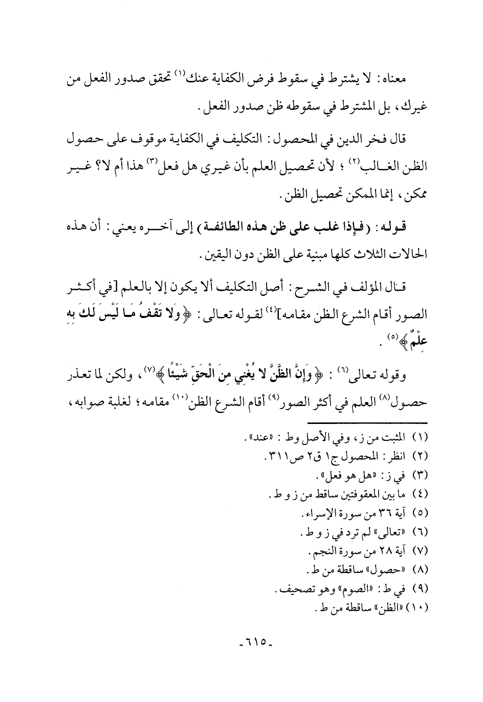 قال المؤلف في الشرح: أصل التكليف ألا يكون إلا بالعلم [في أكثر الصور أقام الشرع الظن مقامه] (٤) لقوله تعالى: {وَلَا تَقْفُ مَا لَيْسَ لَكَ بِهِ عِلْمٌ} (٥).