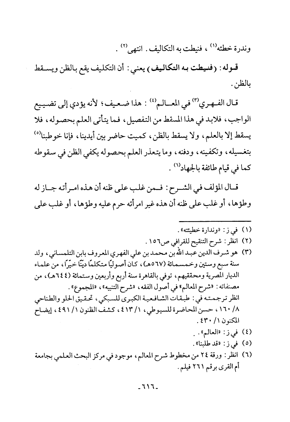 (٦) انظر: ورقة ٢٤ من مخطوط شرح المعالم، موجود في مركز البحث العلمي بجامعة أم القرى برقم ٢٦١ فيلم.