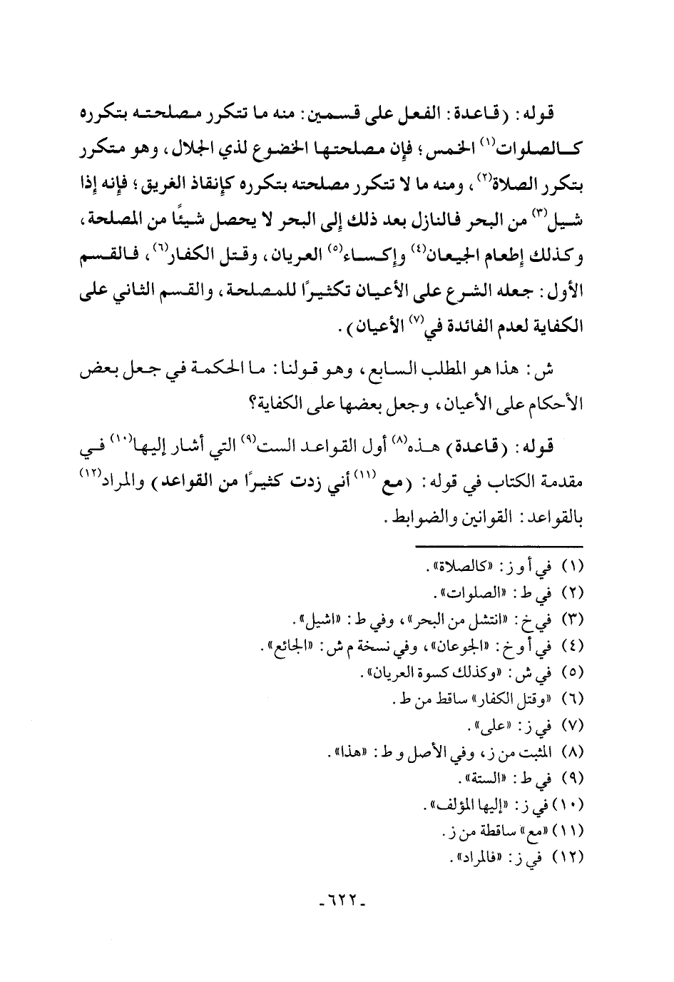 قوله: (قاعدة: الفعل على قسمين: منه ما تتكرر مصلحته بتكرره كالصلوات (١) الخمس؛ فإن مصلحتها الخضوع لذي الجلال، وهو متكرر بتكرر الصلاة (٢)، ومنه ما لا تتكرر مصلحته بتكرره كإِنقاذ الغريق، فإِنه إِذا شيل (٣) من البحر فالنازل بعد ذلك إِلى البحر لا يحصل شيئًا من المصلحة، وكذلك إِطعام الجيعان (٤) وإِكساء (٥) العريان، وقتل الكفار (٦)، فالقسم الأول: جعله الشرع على الأعيان تكثيرًا للمصلحة، والقسم الثاني على الكفاية لعدم الفائدة في (٧) الأعيان).