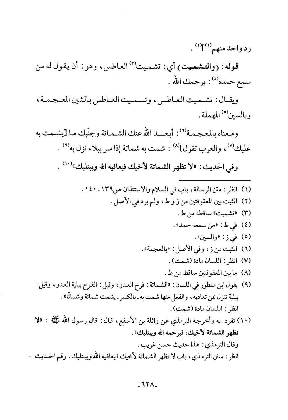 (٩) يقول ابن منظور في اللسان: "الشماتة: فرح العدو، وقيل: الفرح ببلية العدو، وقيل: ببلية تنزل بمن تعاديه، والفعل منها شمت به - بالكسر - يشمت شماتة وشماتًا".