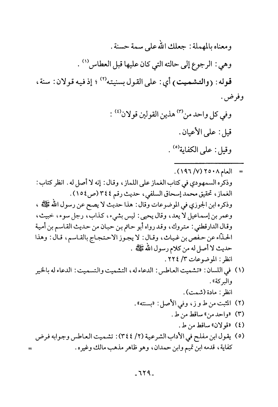 (٥) يقول ابن مفلح في الأداب الشرعية (٢/ ٣٤٤): تشميت العاطس وجوابه فرض كفاية، قدمه ابن تميم وابن حمدان، وهو ظاهر مذهب مالك وغيره. =