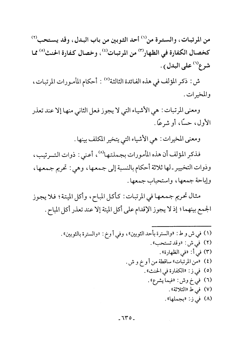 ش: ذكر المؤلف في هذه الفائدة الثالثة (٧): أحكام المأمورات المرتبات، والمخيرات.