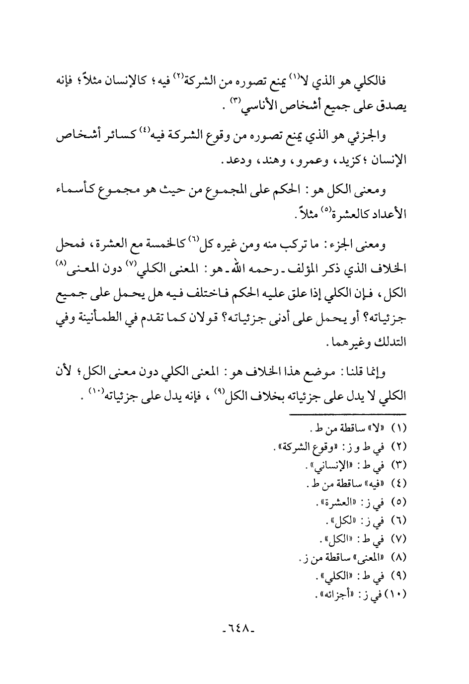 وإنما قلنا: موضع هذا الخلاف هو: المعنى الكلي دون معنى الكل؛ لأن الكلي لا يدل على جزئياته بخلاف الكل (٩)، فإنه يدل على جزئياته (١٠).