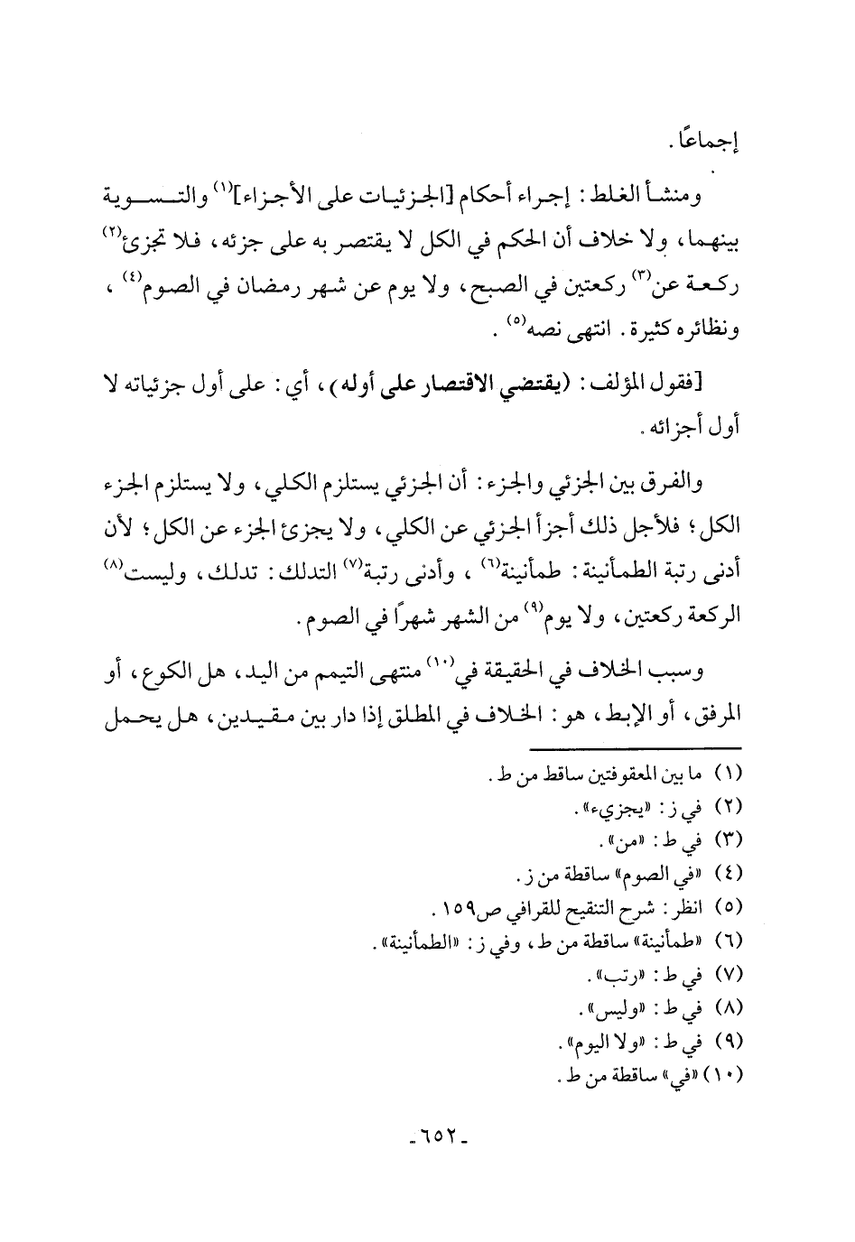 ومنشأ الغلط: إجراء أحكام [الجزئيات على الأجزاء] (١) والتسوية بينهما، ولا خلاف أن الحكم في الكل لا يقتصر به على جزئه، فلا تجزئ (٢) ركعة عن (٣) ركعتين في الصبح، ولا يوم عن شهر رمضان في الصوم (٤)، ونظائره كثيرة. انتهى نصه (٥).