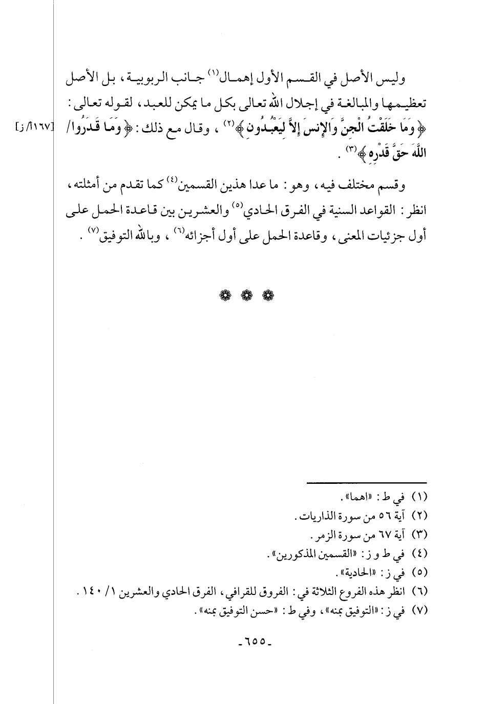 وليس الأصل في القسم الأول إهمال (١) جانب الربوبية، بل الأصل تعظيمها والمبالغة في إجلال الله تعالى بكل ما يمكن للعبد، لقوله تعالى: {وَمَا خَلَقْتُ الْجِنَّ وَالْإِنْسَ إلا لِيَعْبُدُونِ} (٢)، وقال مع ذلك: {وَمَا قَدَرُوا اللَّهَ حَقَّ قَدْرِهِ} (٣).