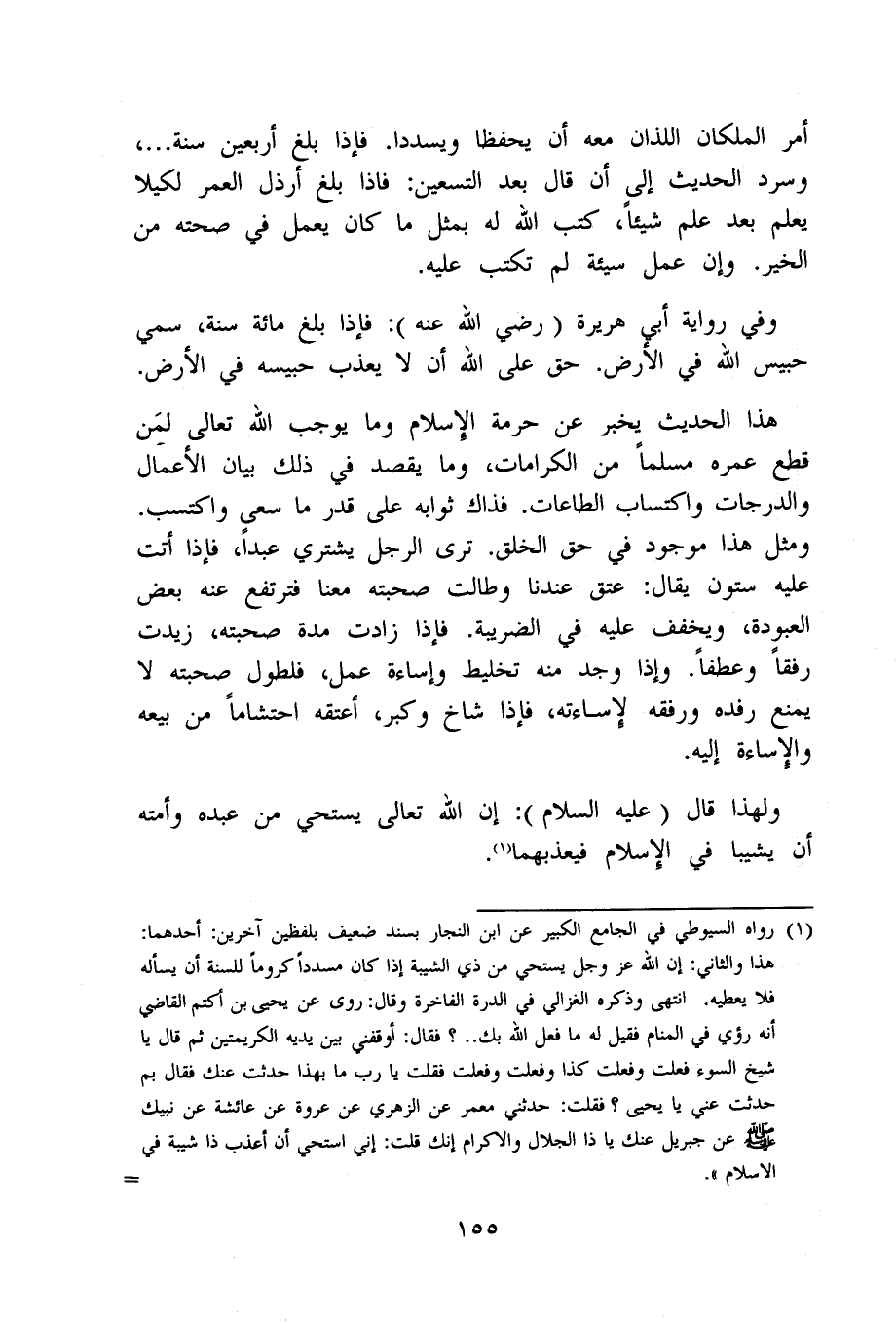 وَفِي رِوَايَة أبي هُرَيْرَة رَضِي الله عَنهُ فَإِذا بلغ مائَة سنة سمي حبيس الله فِي الأَرْض حق على الله أَن لَا يعذب حبيسه فِي الأَرْض هَذَا الحَدِيث يخبر عَن حُرْمَة الْإِسْلَام وَمَا يُوجب الله تَعَالَى لمن قطع عمره مُسلما من الكرامات وَمَا يقْصد فِي ذَلِك بَيَان الْأَعْمَال والدرجات واكتساب الطَّاعَات فَذَاك ثَوَابه على قدر مَا سعى واكتسب وَمثل هَذَا مَوْجُود فِي حق الْخلق ترى الرجل يَشْتَرِي عبدا فَإِذا أَتَت عَلَيْهِ سِتُّونَ يُقَال عتق عندنَا وطالت صحبته مَعنا فترتفع عَنهُ بعض العبودة ويخفف عَلَيْهِ فِي الضريبة فَإِذا زَادَت مُدَّة صحبته زيدت رفقا وعطفا وَإِذا وجد مِنْهُ تَخْلِيط وإساءة عمل فلطول صحبته لَا يمْنَع رفده ورفقه لإساءته فَإِذا شاخ وَكبر اعتقه احتشاما من بَيْعه والإساءة إِلَيْهِ