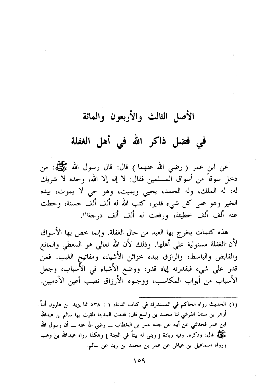 عَن ابْن عمر رَضِي الله عَنْهُمَا قَالَ قَالَ رَسُول الله صلى الله عَلَيْهِ وَسلم من دخل سوقا من أسواق الْمُسلمين فَقَالَ لَا إِلَه إِلَّا الله وَحده لَا شريك لَهُ لَهُ الْملك وَله الْحَمد يحيي وَيُمِيت وَهُوَ حَيّ لَا يَمُوت بِيَدِهِ الْخَيْر وَهُوَ على كل شَيْء قدير كتب الله لَهُ ألف ألف حَسَنَة وحطت عَنهُ ألف ألف خَطِيئَة وَرفعت لَهُ ألف ألف دَرَجَة