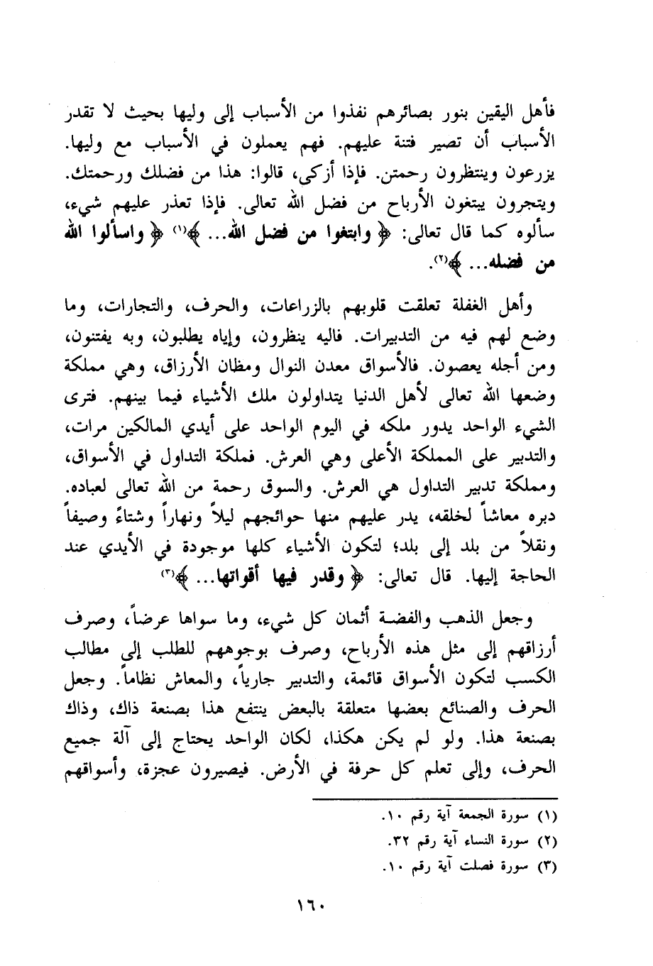 وَجعل الذَّهَب وَالْفِضَّة أَثمَان كل شَيْء وَمَا سواهَا عرضا وَصرف أَرْزَاقهم إِلَى مثل هَذِه الأرباح وَصرف بِوُجُوهِهِمْ للطلب إِلَى مطَالب الْكسْب لتَكون الْأَسْوَاق قَائِمَة وَالتَّدْبِير جَارِيا والمعاش نظاما وَجعل الْحَرْف والصنائع بَعْضهَا مُتَعَلقَة بِالْبَعْضِ ينْتَفع هَذَا بصنعة ذَاك وَذَاكَ بصنعة هَذَا وَلَو لم يكن هَكَذَا لَكَانَ الْوَاحِد يحْتَاج إِلَى آلَة جَمِيع الْحَرْف وَإِلَى تعلم كل حِرْفَة فِي الأَرْض فيصيرون عجزة وأسواقهم