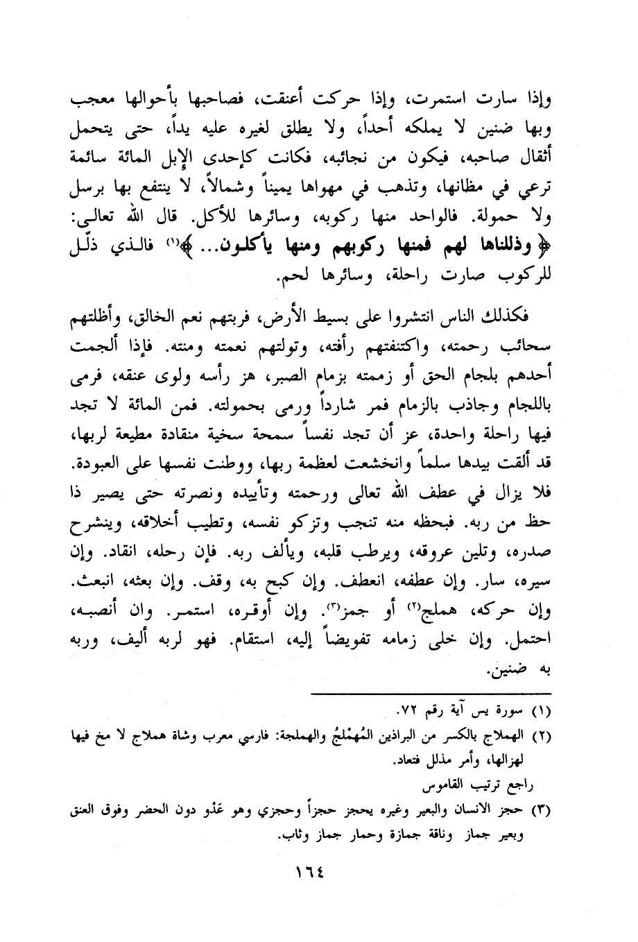 فَكَذَلِك النَّاس انتشروا على بسيط الأَرْض فربتهم نعم الْخَالِق وأظلتهم سحائب رَحمته واكتنفتهم رأفته وتولتهم نعْمَته ومنته فَإِذا ألجمت أحدهم بلجام الْحق أَو زممته بزمام الصَّبْر هز رَأسه ولوى عُنُقه فَرمى باللجام وجاذب بالزمام فَمر شاردا وَرمى بحمولته فَمن الْمِائَة لَا تَجِد فِيهَا رَاحِلَة وَاحِدَة عز أَن تَجِد نفسا سَمْحَة سخية منقادة مطيعة لِرَبِّهَا قد أَلْقَت بِيَدِهَا سلما وانخشعت لِعَظَمَة رَبهَا ووطنت نَفسهَا على العبودة فَلَا يزَال فِي عطف الله تَعَالَى وَرَحمته وتأييده ونصرته حَتَّى يصير ذَا حَظّ من ربه فبحظه مِنْهُ تنجب وتزكو نَفسه وتطيب أخلاقه وينشرح صَدره وتلين عروقه ويرطب قلبه ويألف ربه فَإِن رَحْله انْقَادَ وَإِن سيره سَار وَإِن عطفه انعطف وَإِن كبح بِهِ وقف وَإِن بَعثه انْبَعَثَ وَإِن حركه هملج أَو جمز وَإِن أوقره اسْتمرّ وان أنصبه احْتمل وَإِن خلى زمامه تفويضا إِلَيْهِ استقام فَهُوَ لرَبه أليف وربه بِهِ ضنين