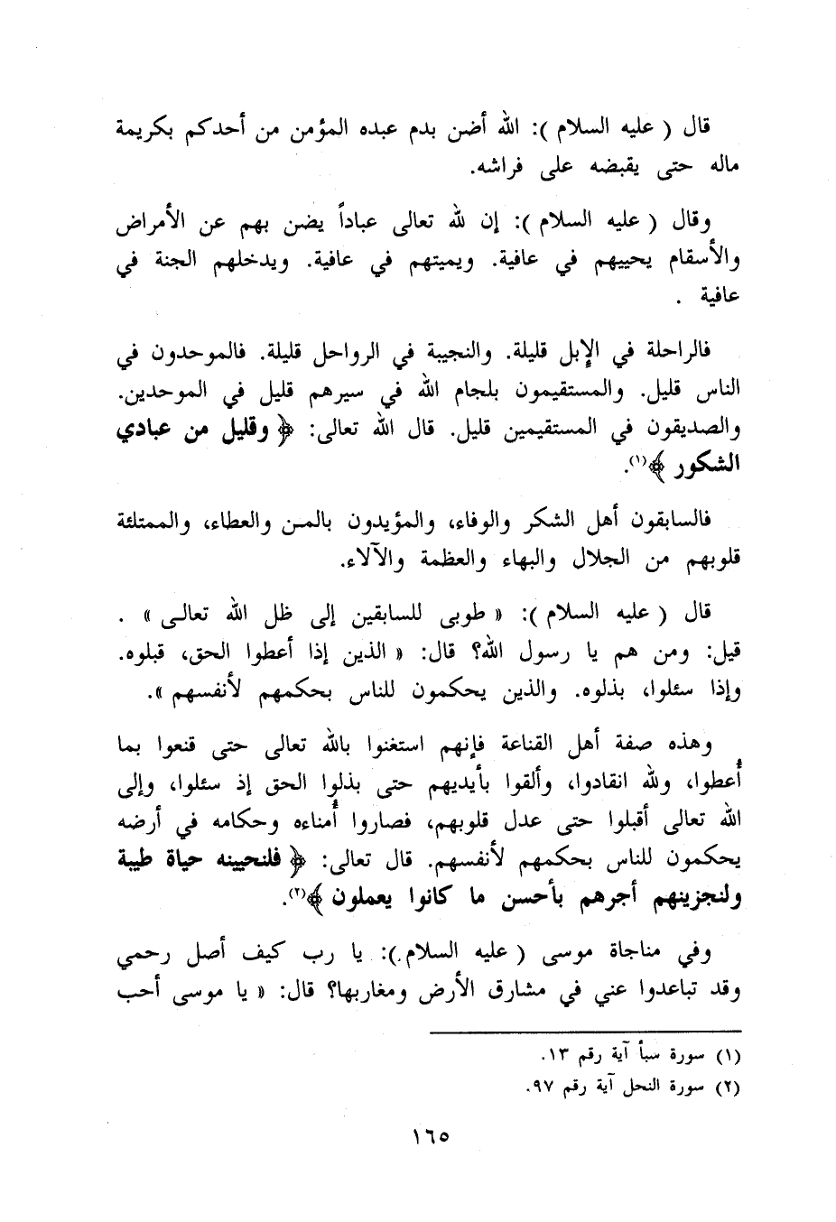 فالراحلة فِي الْإِبِل قَليلَة والنجيبة فِي الرَّوَاحِل قَليلَة فالموحدون فِي النَّاس قَلِيل والمستقيمون بلجام الله فِي سيرهم قَلِيل فِي الْمُوَحِّدين وَالصِّدِّيقُونَ فِي المستقيمين قَلِيل قَالَ الله تَعَالَى وَقَلِيل من عبَادي الشكُور