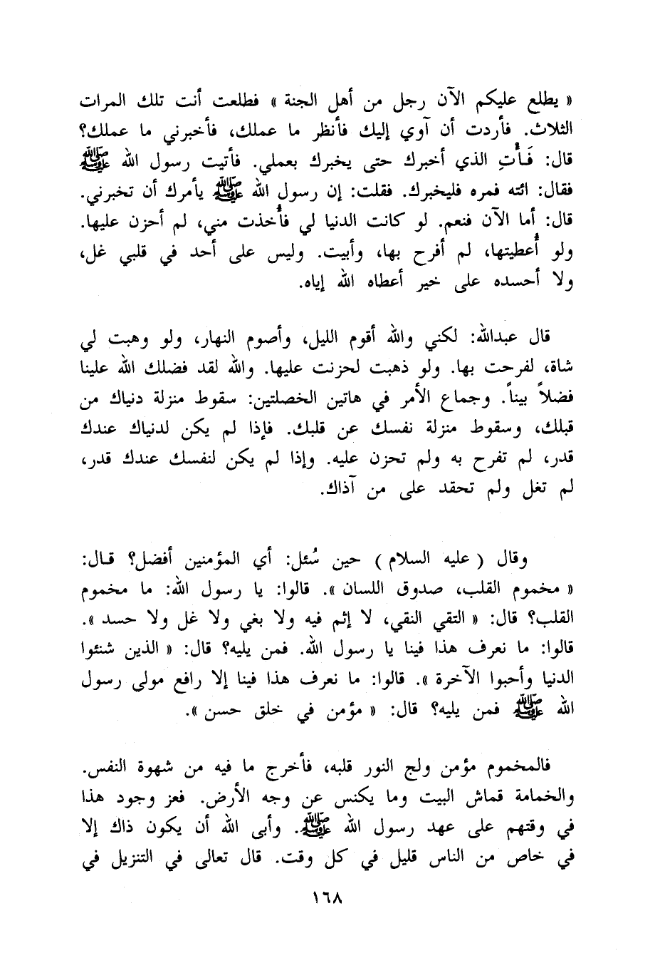 وَقَالَ صلى الله عَلَيْهِ وَسلم حِين سُئِلَ أَي الْمُؤمنِينَ أفضل قَالَ مخموم الْقلب صَدُوق اللِّسَان قَالُوا يَا رَسُول الله مَا مخموم الْقلب قَالَ التقي النقي لَا إِثْم فِيهِ وَلَا بغي وَلَا غل وَلَا حسد قَالُوا مَا نَعْرِف هَذَا فِينَا يَا رَسُول الله فَمن يَلِيهِ قَالَ الَّذين شنئوا الدُّنْيَا وأحبوا الْآخِرَة قَالُوا مَا نَعْرِف هَذَا فِينَا إِلَّا رَافع مولى رَسُول الله صلى الله عَلَيْهِ وَسلم فَمن يَلِيهِ قَالَ مُؤمن فِي خلق حسن
