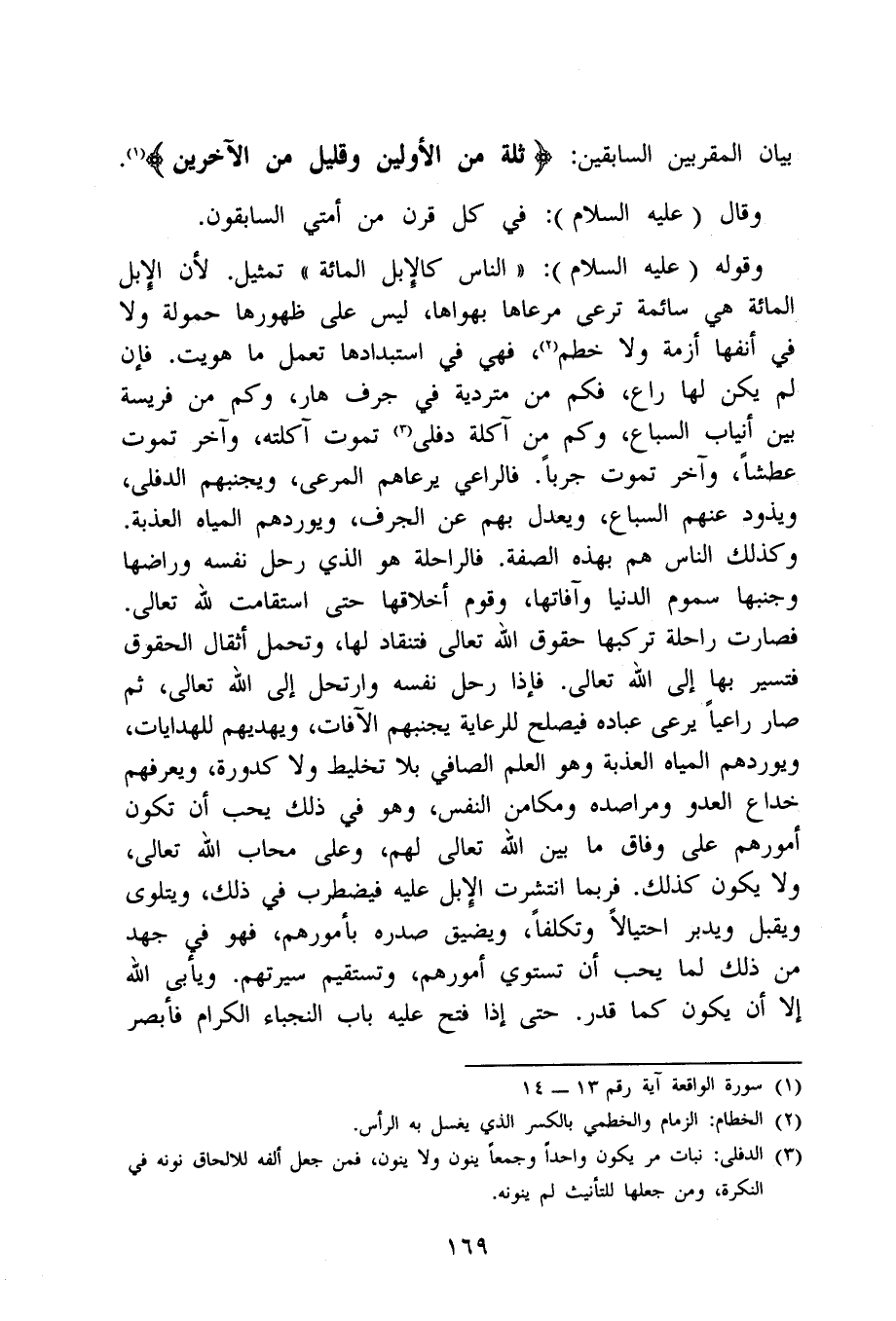 وَقَوله صلى الله عَلَيْهِ وَسلم النَّاس كَالْإِبِلِ الْمِائَة تَمْثِيل لِأَن الْإِبِل الْمِائَة هِيَ سَائِمَة ترعى مرعاها بهواها لَيْسَ على ظُهُورهَا حمولة وَلَا فِي أنفها أزمة ولاخطم فَهِيَ فِي استبدادها تعْمل مَا هويت فَإِن لم يكن لَهَا رَاع فكم من متردية فِي جرف هار وَكم من فريسة بَين أَنْيَاب السبَاع وَكم من آكِلَة دفلى تَمُوت آكلته وَآخر تَمُوت عطشا وَآخر تَمُوت جربا فالراعي يرعاهم المرعى ويجنبهم الدفلى ويذود عَنْهُم السبَاع ويعدل بهم عَن الجرف ويوردهم الْمِيَاه العذبة وَكَذَلِكَ النَّاس هم بِهَذِهِ الصّفة فالراحلة هُوَ الَّذِي رَحل نَفسه وراضها وجنبها سموم الدُّنْيَا وآفاتها وَقوم أخلاقها حَتَّى استقامت لله تَعَالَى فَصَارَت رَاحِلَة تركبها حُقُوق الله تَعَالَى فتنقاد لَهَا وَتحمل أثقال الْحُقُوق فتسير بهَا إِلَى الله تَعَالَى فَإِذا رَحل نَفسه وارتحل إِلَى الله تَعَالَى ثمَّ صَار رَاعيا يرْعَى عباده فيصلح للرعاية يجنبهم الْآفَات ويهديهم للهدايات ويوردهم الْمِيَاه العذبة وَهُوَ الْعلم الصافي بِلَا تَخْلِيط وَلَا كدورة ويعرفهم خداع الْعَدو ومراصده ومكامن النَّفس وَهُوَ فِي ذَلِك يحب أَن تكون أُمُورهم على وفَاق مَا بَين الله تَعَالَى لَهُم وعَلى محاب الله تَعَالَى وَلَا يكون كَذَلِك فَرُبمَا انتشرت الْإِبِل عَلَيْهِ فيضطرب فِي ذَلِك ويتلوى وَيقبل وَيُدبر احتيالا وتكلفا ويضيق صَدره بأمورهم فَهُوَ فِي جهد من ذَلِك لما يحب أَن تستوي أُمُورهم وتستقيم سيرتهم ويأبى الله إِلَّا أَن يكون كَمَا قدر حَتَّى إِذا فتح عَلَيْهِ بَاب النجباء الْكِرَام فأبصر