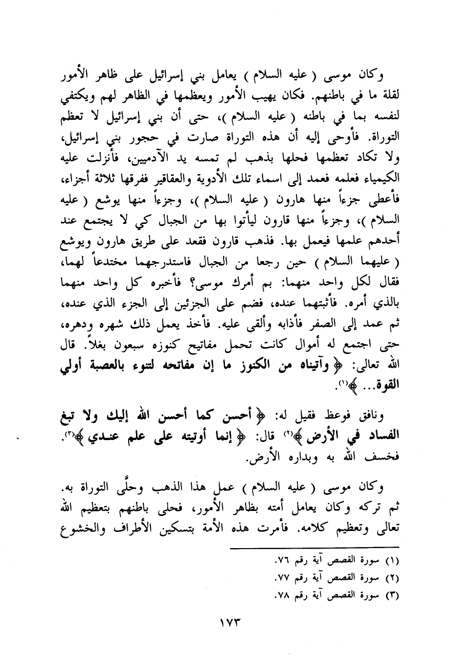 وَكَانَ مُوسَى عَلَيْهِ السَّلَام يُعَامل بني إِسْرَائِيل على ظَاهر الْأُمُور لقلَّة مَا فِي باطنهم فَكَانَ يهيب الْأُمُور ويعظمها فِي الظَّاهِر لَهُم ويكتفي لنَفسِهِ بِمَا فِي بَاطِنه عَلَيْهِ السَّلَام حَتَّى أَن بني إِسْرَائِيل لَا تعظم التَّوْرَاة فَأوحى إِلَيْهِ أَن هَذِه التَّوْرَاة صَارَت فِي حجور بني إِسْرَائِيل وَلَا تكَاد تعظمها فَحلهَا بِذَهَب لم تمسه يَد الْآدَمِيّين فأنزلت عَلَيْهِ الكيمياء فَعلمه فَعمد إِلَى اسماء تِلْكَ الْأَدْوِيَة والعقاقير ففرقها ثَلَاثَة أَجزَاء فَأعْطى جُزْءا مِنْهَا هَارُون عَلَيْهِ السَّلَام وجزءا مِنْهَا يُوشَع عَلَيْهِ السَّلَام وجزءا مِنْهَا قَارون ليأتوا بهَا من الْجبَال كي لَا يجْتَمع عِنْد أحدهم علمهَا فَيعْمل بهَا فَذهب قَارون فَقعدَ على طَرِيق هَارُون ويوشع عَلَيْهِمَا السَّلَام حِين رجعا من الْجبَال فاستدرجهما مختدعا لَهَا فَقَالَ لكل وَاحِد مِنْهُمَا بِمَ أَمرك مُوسَى فَأخْبرهُ كل وَاحِد مِنْهُمَا بِالَّذِي أمره فأثبتهما عِنْده فضم على الجزئين إِلَى الْجُزْء الَّذِي عِنْده ثمَّ عمد إِلَى الصفر فأذابه وَألقى عَلَيْهِ فَأخذ يعْمل ذَلِك شهره ودهره حَتَّى اجْتمع لَهُ أَمْوَال كَانَت تحمل مَفَاتِيح كنوزه سَبْعُونَ بغلا قَالَ الله تَعَالَى وَآتَيْنَاهُ من الْكُنُوز مَا إِن مفاتحه لتنوء بالعصبة أولي الْقُوَّة