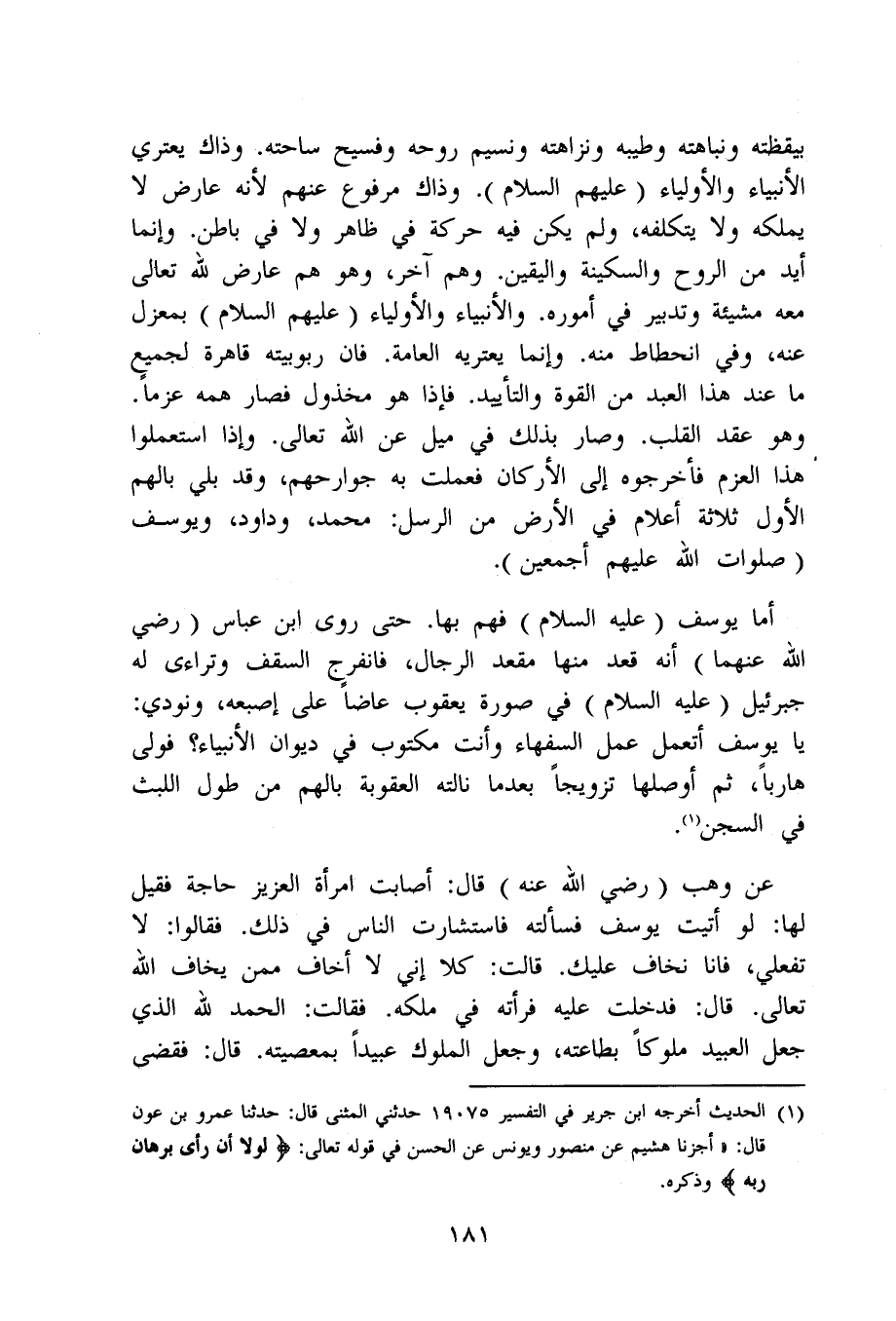 بيقظته ونباهته وطيبه ونزاهته ونسيم روحه وفسيح ساحته وَذَاكَ يعتري الْأَنْبِيَاء والأولياء عَلَيْهِم السَّلَام وَذَاكَ مَرْفُوع عَنْهُم لِأَنَّهُ عَارض لَا يملكهُ وَلَا يتكلفه وَلم يكن فِيهِ حَرَكَة فِي ظَاهر وَلَا فِي بَاطِن وَإِنَّمَا أيد من الرّوح والسكينة وَالْيَقِين وهم آخر وَهُوَ هم عَارض لله تَعَالَى مَعَه مَشِيئَة وتدبير فِي أُمُوره والأنبياء والأولياء عَلَيْهِم السَّلَام بمعزل عَنهُ وَفِي انحطاط مِنْهُ وَإِنَّمَا يَعْتَرِيه الْعَامَّة فان ربوبيته قاهرة لجَمِيع مَا عِنْد هَذَا العَبْد من الْقُوَّة والتأييد فَإِذا هُوَ مخذول فَصَارَ همه عزما وَهُوَ عقد الْقلب وَصَارَ بذلك فِي ميل عَن الله تَعَالَى وَإِذا استعملوا هَذَا الْعَزْم فأخرجوه إِلَى الْأَركان فَعمِلت بِهِ جوارحهم وَقد بلي بالهم الأول ثَلَاثَة أَعْلَام فِي الأَرْض من الرُّسُل مُحَمَّد وَدَاوُد ويوسف صلوَات الله عَلَيْهِم أَجْمَعِينَ