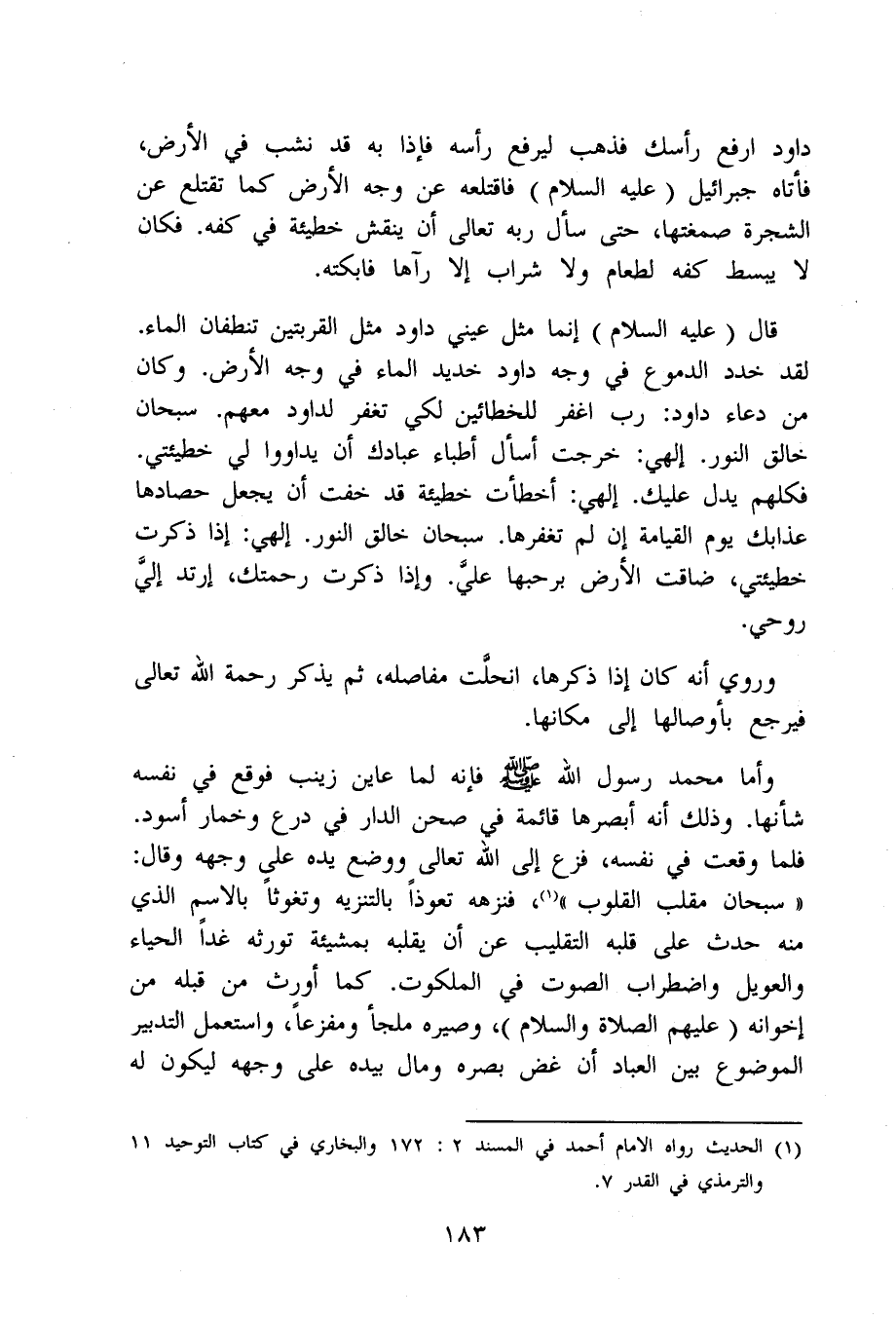 قَالَ صلى الله عَلَيْهِ وَسلم إِنَّمَا مثل عَيْني دَاوُد مثل القربتين تنطفان المَاء لقد خدد الدُّمُوع فِي وَجه دَاوُد خديد المَاء فِي وَجه الأَرْض وَكَانَ من دُعَاء دَاوُد رب اغْفِر للخطائين لكَي تغْفر لداود مَعَهم سُبْحَانَ خَالق النُّور إلهي خرجت أسأَل أطباء عِبَادك أَن يداووا لي خطيئتي فكلهم يدل عَلَيْك إلهي أَخْطَأت خَطِيئَة قد خفت أَن يَجْعَل حصادها عذابك يَوْم الْقِيَامَة إِن لم تغفرها سُبْحَانَ خَالق النُّور إلهي إِذا ذكرت خطيئتي ضَاقَتْ الأَرْض برحبها عَليّ وَإِذا ذكرت رحمتك إرتد إِلَيّ روحي