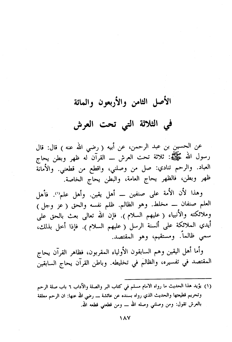 عَن الْحُسَيْن بن عبد الرَّحْمَن عَن أَبِيه رَضِي الله عَنهُ قَالَ قَالَ رَسُول الله صلى الله عَلَيْهِ وَسلم ثَلَاثَة تَحت الْعَرْش الْقُرْآن لَهُ ظهر وبطن يحاج الْعباد وَالرحم تنادي صل من وصلني واقطع من قطعني وَالْأَمَانَة ظهر وبطن فالظهر يحاج الْعَامَّة والبطن يحاج الْخَاصَّة