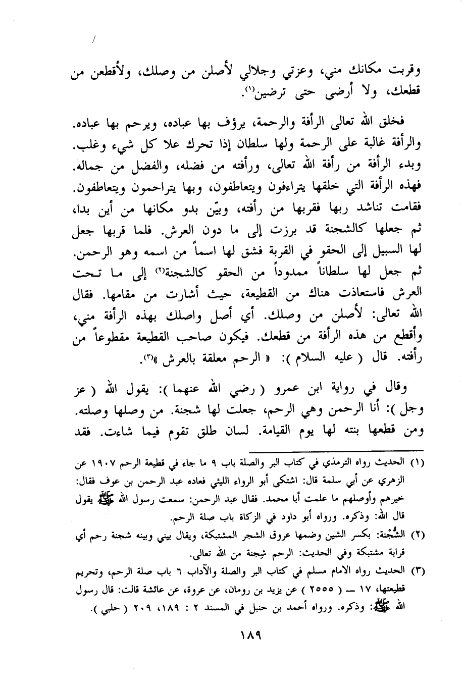 فخلق الله تَعَالَى الرأفة وَالرَّحْمَة يرؤف بهَا عباده وَيرْحَم بهَا عباده والرأفة غالبة على الرَّحْمَة وَلها سُلْطَان إِذا تحرّك علا كل شَيْء وَغلب وبدء الرأفة من رأفة الله تَعَالَى ورأفته من فَضله وَالْفضل من جماله فَهَذِهِ الرأفة الَّتِي خلقهَا يتراءفون ويتعاطفون وَبهَا يتراحمون ويتعاطفون فَقَامَتْ تناشد رَبهَا فقربها من رأفته وَبَين بَدو مَكَانهَا من أَيْن بداثم جعلهَا كالشجنة قد برزت إِلَى مَا دون الْعَرْش فَلَمَّا قربهَا جعل لَهَا السَّبِيل إِلَى الحقو فِي الْقرْبَة فشق لَهَا اسْما من اسْمه وَهُوَ الرَّحْمَن ثمَّ جعل لَهَا سُلْطَانا ممدودا من الحقو كالشجنة إِلَى مَا تَحت الْعَرْش فاستعاذت هُنَاكَ من القطيعة حَيْثُ أشارت من مقَامهَا فَقَالَ الله تَعَالَى لأصلن من وصلك أَي اصل واصلك بِهَذِهِ الرأفة مني وأقطع من هَذِه الرأفة من قَطعك فَيكون صَاحب القطيعة مَقْطُوعًا من رأفته قَالَ صلى الله عَلَيْهِ وَسلم الرَّحِم معلقَة بالعرش