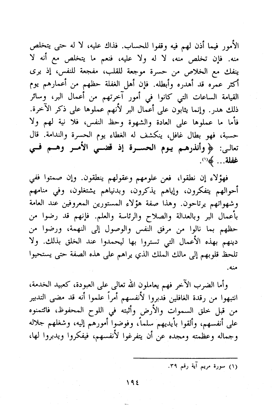 الْأُمُور فِيمَا أذن لَهُم فِيهِ وقفُوا لِلْحسابِ فَذَاك عَلَيْهِ لَا لَهُ حَتَّى يتَخَلَّص مِنْهُ فَإِن تخلص مِنْهُ لَا لَهُ وَلَا عَلَيْهِ فَنعم مَا يتَخَلَّص مَعَ أَنه لَا يَنْفَكّ مَعَ الْخَلَاص من حسرة موجعة للقلب مفجعة للنَّفس إِذْ يرى أَكثر عمره قد أهدره وأبطله فَإِن أهل الْغَفْلَة حظهم من أعمارهم يَوْم الْقِيَامَة السَّاعَات الَّتِي كَانُوا فِي أُمُور آخرتهم من أَعمال الْبر وَسَائِر ذَلِك هدر وَإِنَّمَا يثابون على أَعمال الْبر لأَنهم عملوها على ذكر الاخرة فَأَما مَا عملوها على الْعَادة والشهوة وحظ النَّفس فَلَا نِيَّة لَهُم وَلَا حسبَة فَهُوَ بطال غافل ينْكَشف لَهُ الغطاء يَوْم الْحَسْرَة والندامة قَالَ تَعَالَى وَأَنْذرهُمْ يَوْم الْحَسْرَة إِذْ قضي الْأَمر وهم فِي غَفلَة