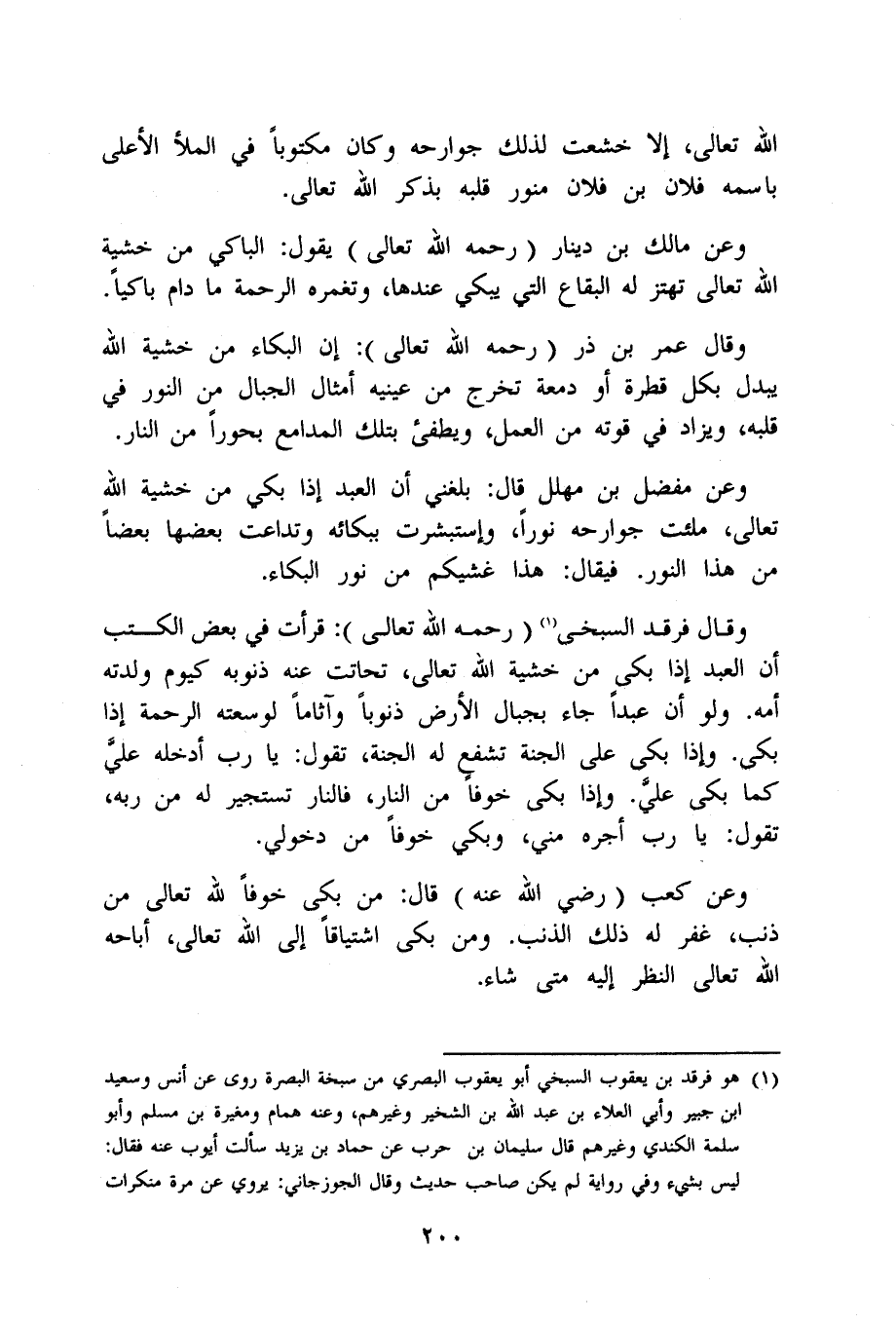 وَقَالَ فرقد السبخى رَحمَه الله تَعَالَى قَرَأت فِي بعض الْكتب أَن العَبْد إِذا بَكَى من خشيَة الله تَعَالَى تحاتت عَنهُ ذنُوبه كَيَوْم وَلدته أمه وَلَو أَن عبدا جَاءَ بجبال الأَرْض ذنوبا وآثاما لوسعته الرَّحْمَة إِذا بَكَى وَإِذا بَكَى على الْجنَّة تشفع لَهُ الْجنَّة تَقول يَا رب أدخلهُ عَليّ كَمَا بَكَى عَليّ وَإِذا بَكَى خوفًا من النَّار فَالنَّار تستجير لَهُ من ربه تَقول يَا رب أجره مني وبكي خوفًا من دخولي