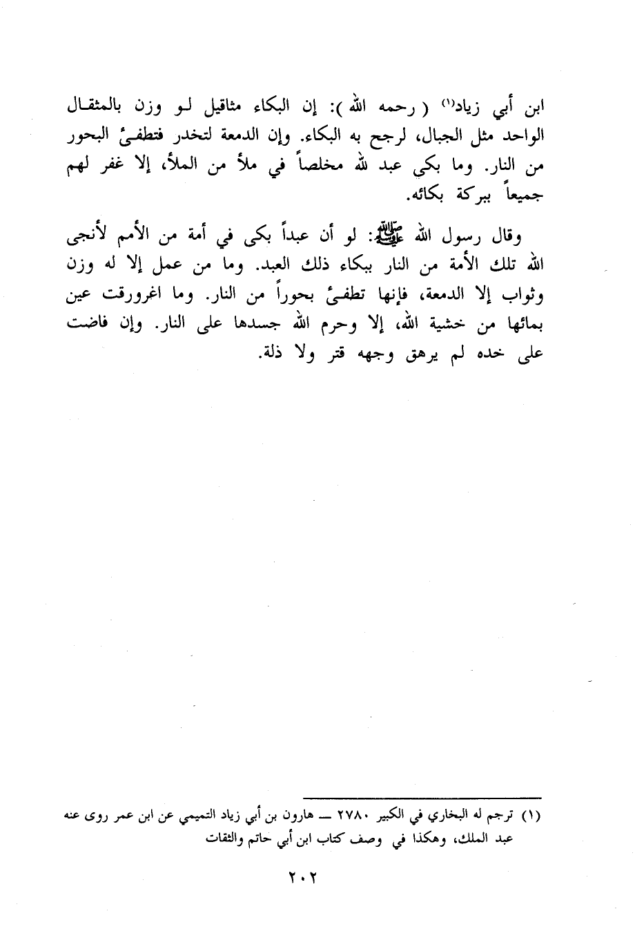 ابْن أبي زِيَاد رَحمَه الله إِن الْبكاء مَثَاقِيل لَو وزن بالمثقال الْوَاحِد مثل الْجبَال لرجح بِهِ الْبكاء وَإِن الدمعة لتخدر فتطفىء البحور من النَّار وَمَا بَكَى عبد لله مخلصا فِي مَلأ من الْمَلأ إِلَّا غفر لَهُم جَمِيعًا ببركة بكائه