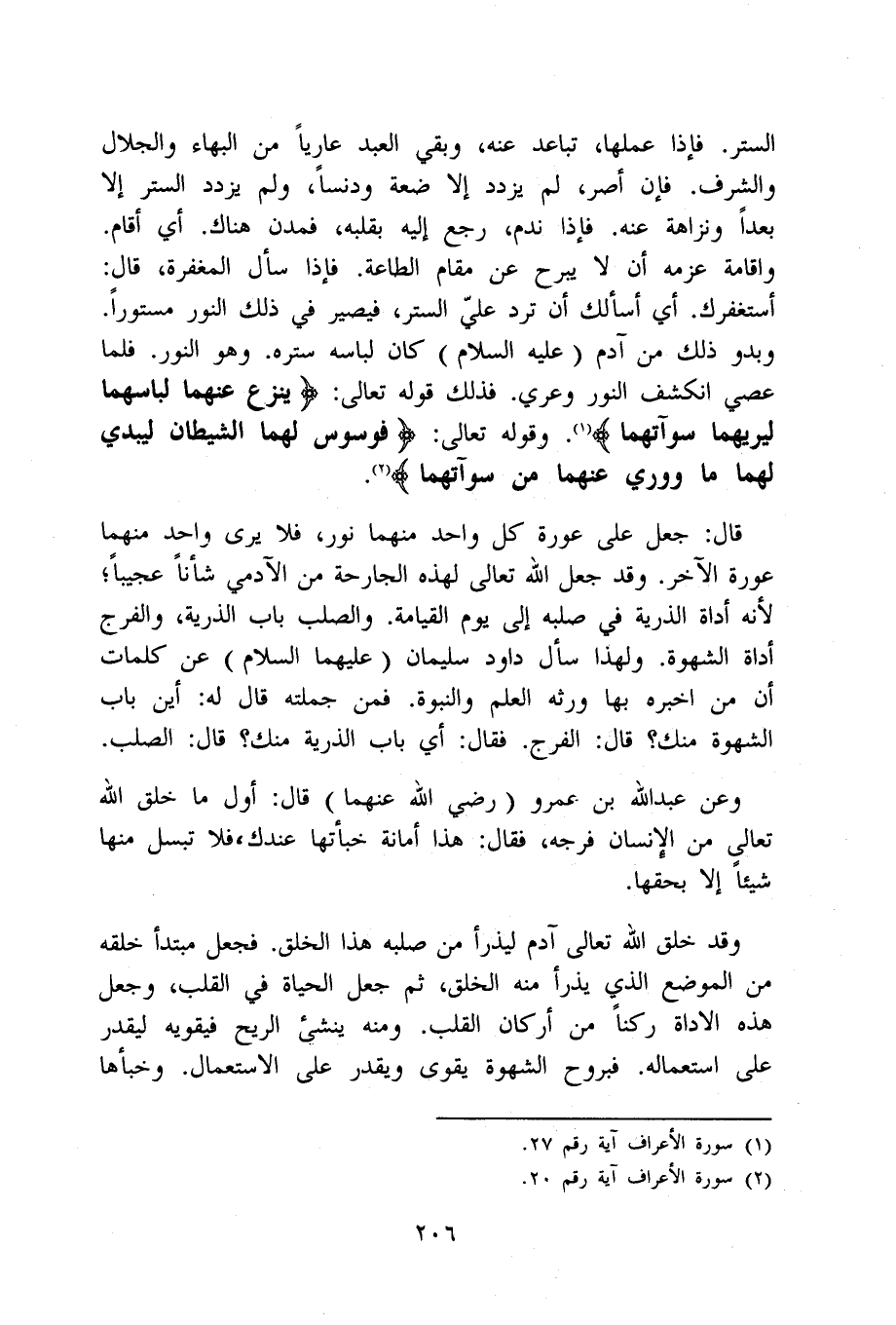 قَالَ جعل على عَورَة كل وَاحِد مِنْهُمَا نور فَلَا يرى وَاحِد مِنْهُمَا عَورَة الآخر وَقد جعل الله تَعَالَى لهَذِهِ الْجَارِحَة من الْآدَمِيّ شَأْنًا عجيبا لِأَنَّهُ أَدَاة الذُّرِّيَّة فِي صلبه إِلَى يَوْم الْقِيَامَة والصلب بَاب الذُّرِّيَّة والفرج أَدَاة الشَّهْوَة وَلِهَذَا سَأَلَ دَاوُد سُلَيْمَان عَلَيْهِمَا السَّلَام عَن كَلِمَات أَن من اخبره بهَا وَرثهُ الْعلم والنبوة فَمن جملَته قَالَ لَهُ أَيْن بَاب الشَّهْوَة مِنْك قَالَ الْفرج فَقَالَ أَي بَاب الذُّرِّيَّة مِنْك قَالَ الصلب
