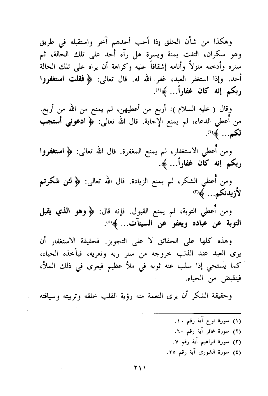 وَهَذِه كلهَا على الْحَقَائِق لَا على التجويز فحقيقة الاسْتِغْفَار أَن يرى العَبْد عِنْد الذَّنب خُرُوجه من ستر ربه وتعريه فَيَأْخذهُ الْحيَاء كَمَا يستحي إِذا سلب عَنهُ ثَوْبه فِي مَلأ عَظِيم فيعرى فِي ذَلِك الْمَلأ فينقبض من الْحيَاء