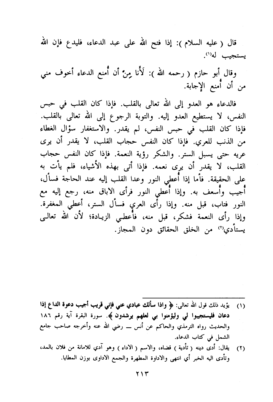 فالدعاء هُوَ الْعَدو إِلَى الله تَعَالَى بِالْقَلْبِ فَإِذا كَانَ الْقلب فِي حبس النَّفس لَا يَسْتَطِيع الْعَدو إِلَيْهِ وَالتَّوْبَة الرُّجُوع إِلَى الله تَعَالَى بِالْقَلْبِ فَإِذا كَانَ الْقلب فِي حبس النَّفس لم يقدر وَالِاسْتِغْفَار سُؤال الغطاء من الذَّنب للعري فَإِذا كَانَ النَّفس حجاب الْقلب لَا يقدر أَن يرى عريه حتي يسبل السّتْر وَالشُّكْر رُؤْيَة النِّعْمَة فَإِذا كَانَ النَّفس حجاب الْقلب لَا يقدر أَن يرى نعمه فَإِذا أُتِي بِهَذِهِ الْأَشْيَاء فَلم يَأْتِ بِهِ على الْحَقِيقَة فإمَّا إِذا أعْطى النُّور وَعدا الْقلب إِلَيْهِ عِنْد الْحَاجة فَسَأَلَ أُجِيب وأسعف بِهِ وَإِذا أعطي النُّور فَرَأى الاباق مِنْهُ رَجَعَ إِلَيْهِ مَعَ النُّور فَتَابَ قبل مِنْهُ وَإِذا رأى العري فَسَأَلَ السّتْر أعطي الْمَغْفِرَة وَإِذا رأى النِّعْمَة فَشكر قبل مِنْهُ فَأعْطِي الزِّيَادَة لِأَن الله تَعَالَى يستأدي من الْخلق الْحَقَائِق دون الْمجَاز