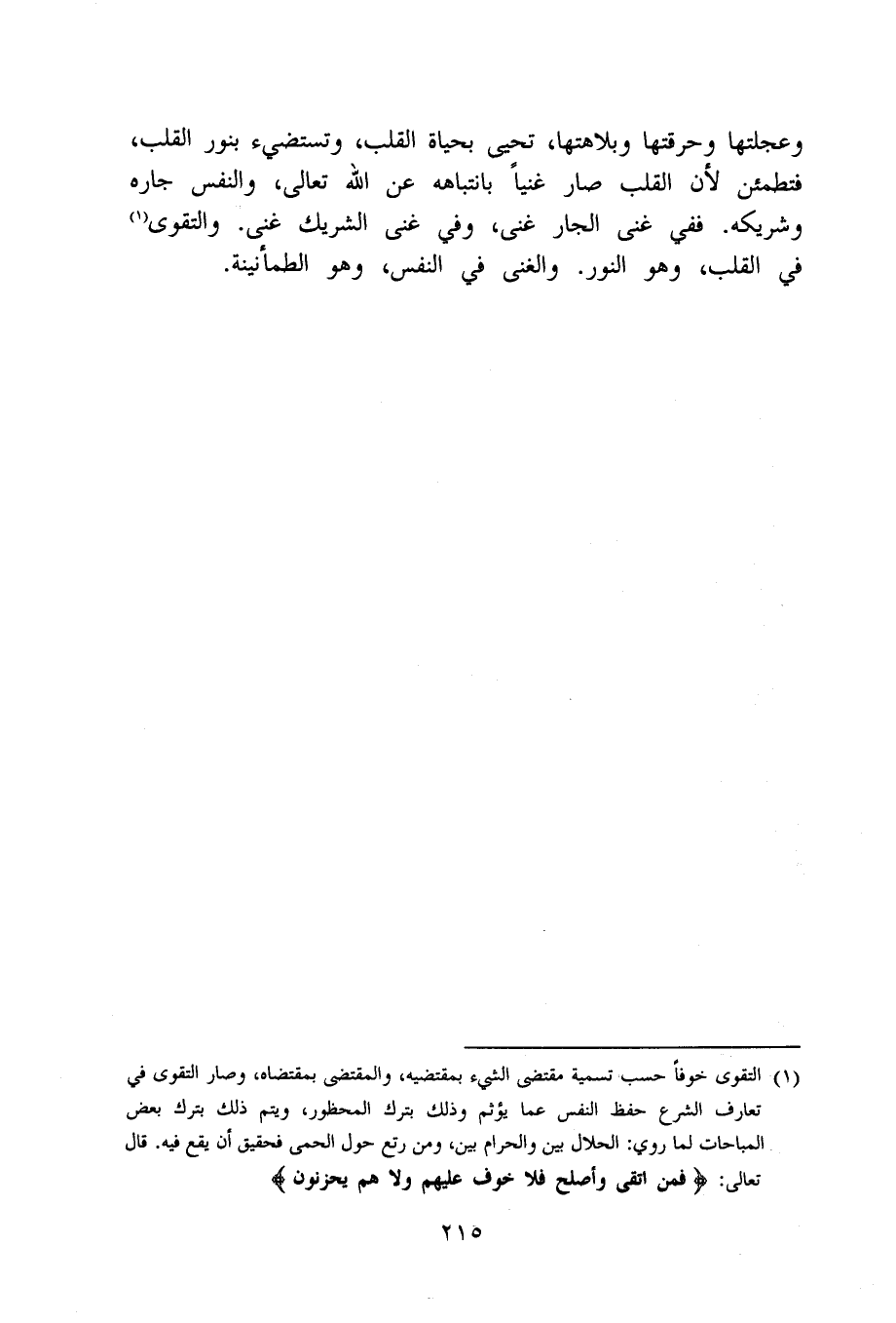 وعجلتها وحرقتها وبلاهتها تحيى بحياة الْقلب وتستضيء بِنور الْقلب فتطمئن لِأَن الْقلب صَار غَنِيا بانتباهه عَن الله تَعَالَى وَالنَّفس جَاره وشريكه فَفِي غنى الْجَار غنى وَفِي غنى الشَّرِيك غنى وَالتَّقوى فِي الْقلب وَهُوَ النُّور والغنى فِي النَّفس وَهُوَ الطمأنية