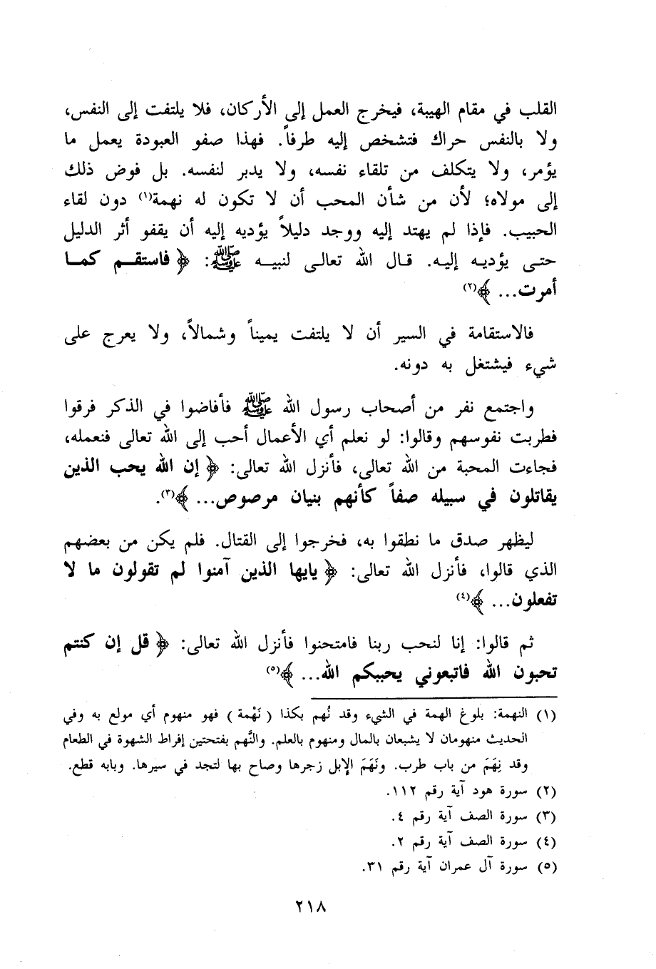 الْقلب فِي مقَام الهيبة فَيخرج الْعَمَل إِلَى الْأَركان فَلَا يلْتَفت إِلَى النَّفس وَلَا بِالنَّفسِ حراك فتشخص إِلَيْهِ طرفا فَهَذَا صفو العبودة يعْمل مَا يُؤمر وَلَا يتَكَلَّف من تِلْقَاء نَفسه وَلَا يدبر لنَفسِهِ بل فوض ذَلِك إِلَى مَوْلَاهُ لِأَن من شَأْن الْمُحب أَن لَا تكون لَهُ نهمة دون لِقَاء الحبيب فَإِذا لم يهتد إِلَيْهِ وَوجد دَلِيلا يُؤَدِّيه إِلَيْهِ أَن يققو أثر الدَّلِيل حَتَّى يُؤَدِّيه إِلَيْهِ قَالَ الله تَعَالَى لنَبيه صلى الله عَلَيْهِ وَسلم فاستقم كَمَا أمرت