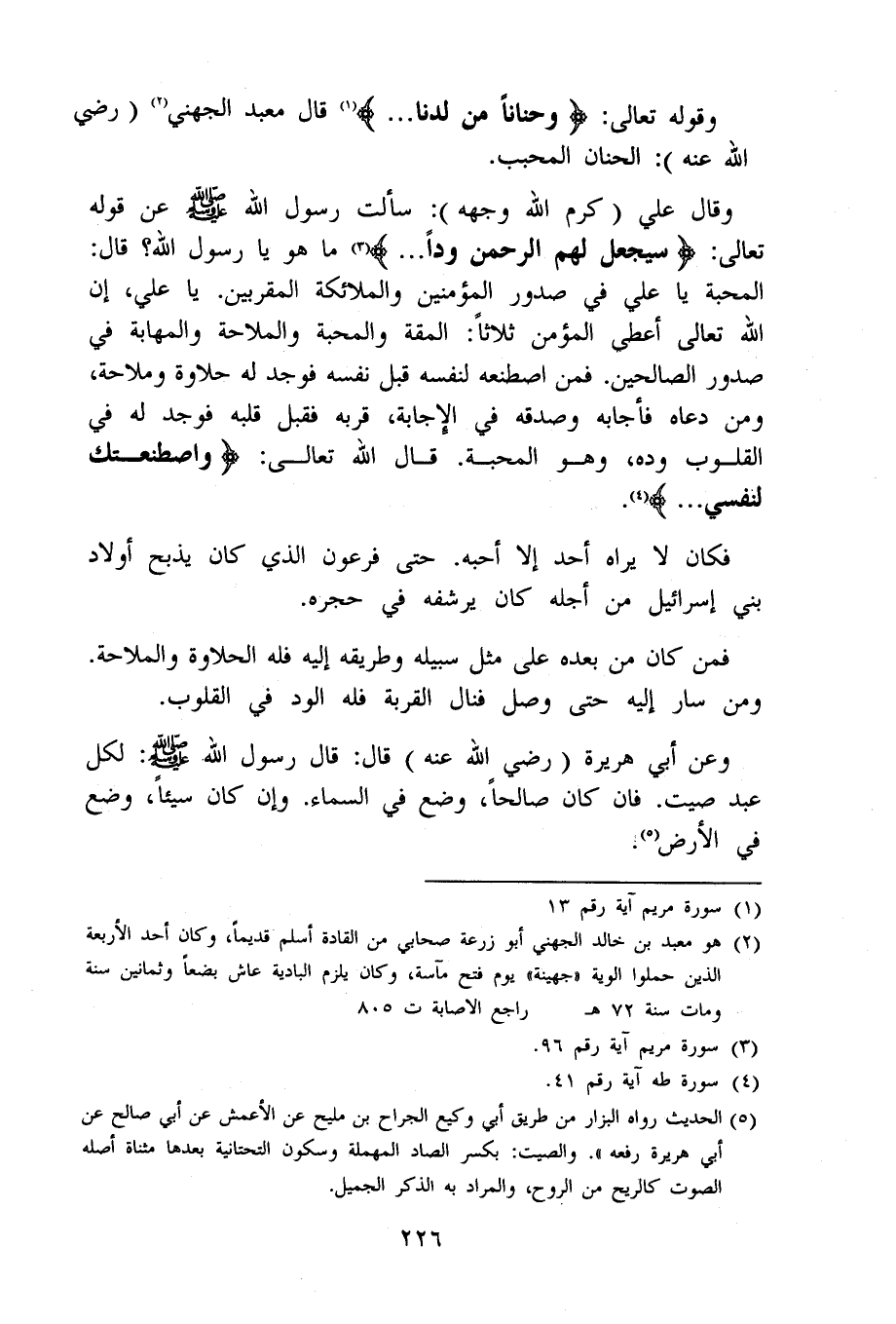 وَقَالَ عَليّ كرم الله وَجهه سَأَلت رَسُول الله صلى الله عَلَيْهِ وَسلم عَن قَوْله تَعَالَى {سَيجْعَلُ لَهُم الرَّحْمَن ودا} مَا هُوَ يَا رَسُول الله قَالَ الْمحبَّة يَا عَليّ فِي صُدُور الْمُؤمنِينَ وَالْمَلَائِكَة المقربين يَا عَليّ إِن الله تَعَالَى أعْطى الْمُؤمن ثَلَاثًا المقة والمحبة والملاحة والمهابة فِي صُدُور الصَّالِحين فَمن اصطنعه لنَفسِهِ قبل نَفسه فَوجدَ لَهُ حلاوة وملاحة وَمن دَعَاهُ فَأَجَابَهُ وَصدقه فِي الإفجابة قربه فَقبل قلبه فَوجدَ لَهُ فِي الْقُلُوب وده وَهُوَ الْمحبَّة قَالَ الله تَعَالَى {واصطنعتك لنَفْسي}