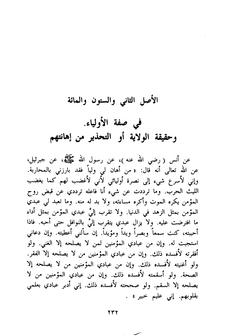 عَن أنس رَضِي الله عَنهُ عَن رَسُول الله صلى الله عَلَيْهِ وَسلم عَن جبرئيل عَن الله تَعَالَى أَنه قَالَ من أهان لي وليا فقد بارزني بالمحاربة وَإِنِّي لأسرع شَيْء إِلَى نصْرَة أوليائي لِأَنِّي لأغضب لَهُم كَمَا يغْضب اللَّيْث الْحَرْب وَمَا ترددت عَن شَيْء أَنا فَاعله ترددي عَن قبض روح الْمُؤمن يكره الْمَوْت وأكره مساءته وَلَا بُد لَهُ مِنْهُ وَمَا تعبد لي عَبدِي الْمُؤمن بِمثل الزّهْد فِي الدُّنْيَا وَلَا تقرب إِلَيّ عَبدِي الْمُؤمن بِمثل أَدَاء مَا افترضت عَلَيْهِ وَلَا يزَال عَبدِي يتَقرَّب إِلَيّ بالنوافل حَتَّى أحبه فاذا أحببته كنت سمعا وبصرا ويدا ومؤيدا إِن سَأَلَني أَعْطيته وَإِن دَعَاني استجبت لَهُ وَإِن من عبَادي الْمُؤمنِينَ لمن لَا يصلحه إِلَّا الْغَنِيّ وَلَو أفقرته لأفسده ذَلِك وَإِن من عبَادي الْمُؤمنِينَ من لَا يصلحه إِلَّا الْفقر وَلَو أغنيته لأفسده ذَلِك وَإِن من عبَادي الْمُؤمنِينَ من لَا يصلحه إِلَّا الصِّحَّة وَلَو أسقمته لأفسده ذَلِك وَإِن من عبَادي الْمُؤمنِينَ من لَا يصلحه إِلَّا السقم وَلَو صححته لأفسده ذَلِك إِنِّي أدبر عبَادي بعلمي بقلوبهم إِنِّي عليم خَبِير