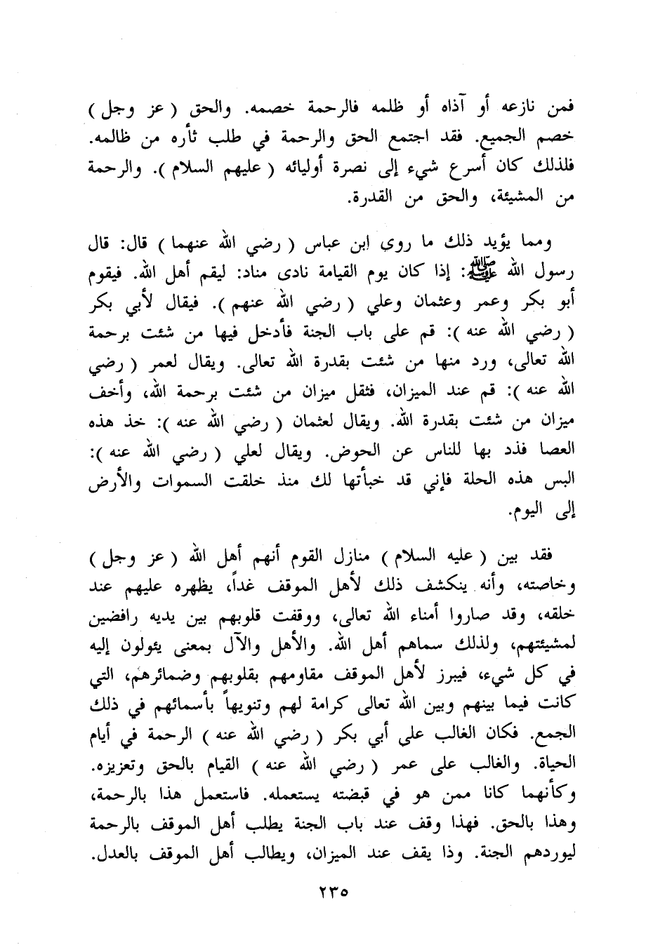 فقد بَين صلى الله عَلَيْهِ وَسلم منَازِل الْقَوْم أَنهم أهل الله عز وَجل وخاصته وَأَنه ينْكَشف ذَلِك لأهل الْموقف غَدا يظهره عَلَيْهِم عِنْد خلقه وَقد صَارُوا أُمَنَاء الله تَعَالَى ووقفت قُلُوبهم بَين يَدَيْهِ رافضين لمشيئتهم وَلذَلِك سماهم أهل الله والأهل والآل بِمَعْنى يئولون إِلَيْهِ فِي كل شَيْء فيبرز لأهل الْموقف مقاومهم بقلوبهم وضمائرهم الَّتِي كَانَت فِيمَا بَينهم وَبَين الله تَعَالَى كَرَامَة لَهُم وتنويها بِأَسْمَائِهِمْ فِي ذَلِك الْجمع فَكَانَ الْغَالِب على أبي بكر رَضِي الله عَنهُ الرَّحْمَة فِي أَيَّام الْحَيَاة وَالْغَالِب على عمر رَضِي الله عَنهُ الْقيام بِالْحَقِّ وتعزيزه وكأنهما كَانَا مِمَّن هُوَ فِي قَبضته يَسْتَعْمِلهُ فَاسْتعْمل هَذَا بِالرَّحْمَةِ وَهَذَا بِالْحَقِّ فَهَذَا وقف عِنْد بَاب الْجنَّة يطْلب أهل الْموقف بِالرَّحْمَةِ ليوردهم الْجنَّة وَذَا يقف عِنْد الْمِيزَان وَيُطَالب أهل الْموقف بِالْعَدْلِ