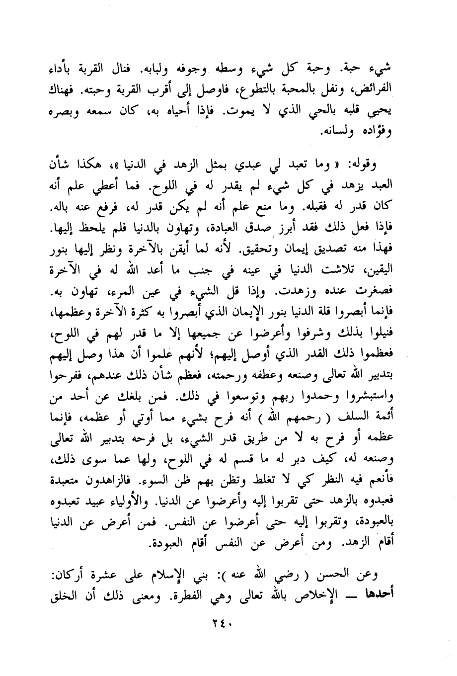 وَقَوله وَمَا تعبد لي عَبدِي بِمثل الزّهْد فِي الدُّنْيَا هَكَذَا شَأْن العَبْد يزهد فِي كل شَيْء لم يقدر لَهُ فِي اللَّوْح فَمَا أعطي علم أَنه كَانَ قدر لَهُ فَقبله وَمَا منع علم أَنه لم يكن قدر لَهُ فَرفع عَنهُ باله فَإِذا فعل ذَلِك فقد أبرز صدق الْعِبَادَة وتهاون بالدنيا فَلم يلحظ إِلَيْهَا فَهَذَا مِنْهُ تَصْدِيق إِيمَان وَتَحْقِيق لِأَنَّهُ لما أَيقَن بِالآخِرَة وَنظر إِلَيْهَا بِنور الْيَقِين تلاشت الدُّنْيَا فِي عينه فِي جنب مَا أعد الله لَهُ فِي الْآخِرَة فصغرت عِنْده وزهدت وَإِذا قل الشَّيْء فِي عين الْمَرْء تهاون بِهِ فَإِنَّمَا أبصروا قلَّة الدُّنْيَا بِنور الْإِيمَان الَّذِي أبصروا بِهِ كَثْرَة الْآخِرَة وعظمها فنيلوا بذلك وشرفوا وأعرضوا عَن جَمِيعهَا إِلَّا مَا قدر لَهُم فِي اللَّوْح فَعَظمُوا ذَلِك الْقدر الَّذِي أوصل إِلَيْهِم لأَنهم علمُوا أَن هَذَا وصل إِلَيْهِم بتدبير الله تَعَالَى وصنعه وَعطفه وَرَحمته فَعظم شَأْن ذَلِك عِنْدهم فَفَرِحُوا وَاسْتَبْشَرُوا وحمدوا رَبهم وتوسعوا فِي ذَلِك فَمن بلغك عَن أحد من أَئِمَّة السّلف رَحِمهم الله أَنه فَرح بِشَيْء مِمَّا أُوتِيَ أَو عظمه فَإِنَّمَا عظمه أَو فَرح بِهِ لَا من طَرِيق قدر الشَّيْء بل فرحه بتدبير الله تَعَالَى وصنعه لَهُ كَيفَ دبر لَهُ مَا قسم لَهُ فِي اللَّوْح وَلها عَمَّا سوى ذَلِك فأنعم فِيهِ النّظر كي لَا تغلط وتظن بهم ظن السوء فالزاهدون متعبدة فعبدوه بالزهد حَتَّى تقربُوا إِلَيْهِ وأعرضوا عَن الدُّنْيَا والأولياء عبيد تَعْبُدُوهُ بالعبودة وتقربوا إِلَيْهِ حَتَّى أَعرضُوا عَن النَّفس فَمن أعرض عَن الدُّنْيَا أَقَامَ الزّهْد وَمن أعرض عَن النَّفس أَقَامَ العبودة