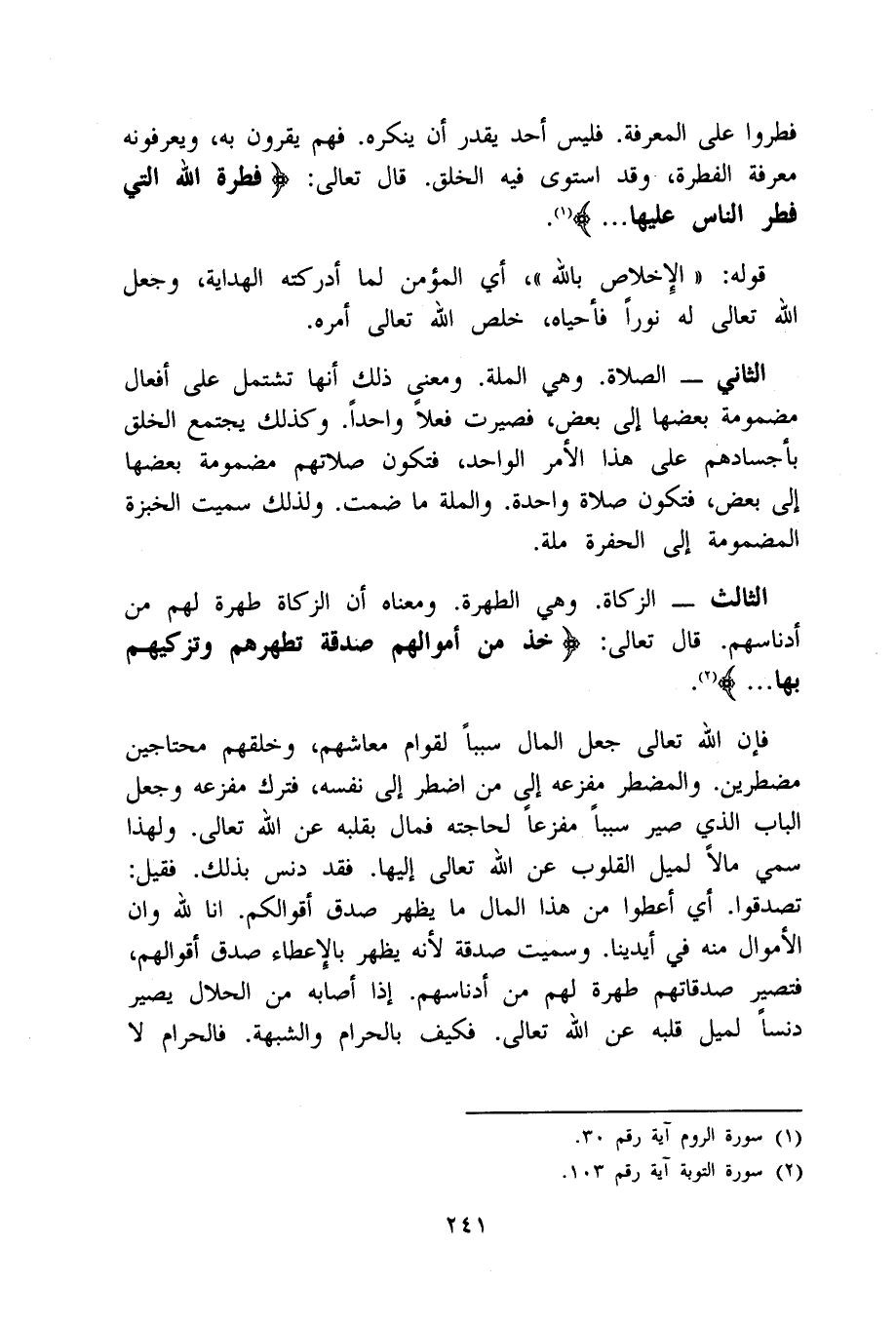 الثَّالِث الزَّكَاة وَهِي الطهرة وَمَعْنَاهُ أَن الزَّكَاة طهرة لَهُم من أدناسهم قَالَ تَعَالَى خُذ من أَمْوَالهم صَدَقَة تطهرهُمْ وتزكيهم بهَا