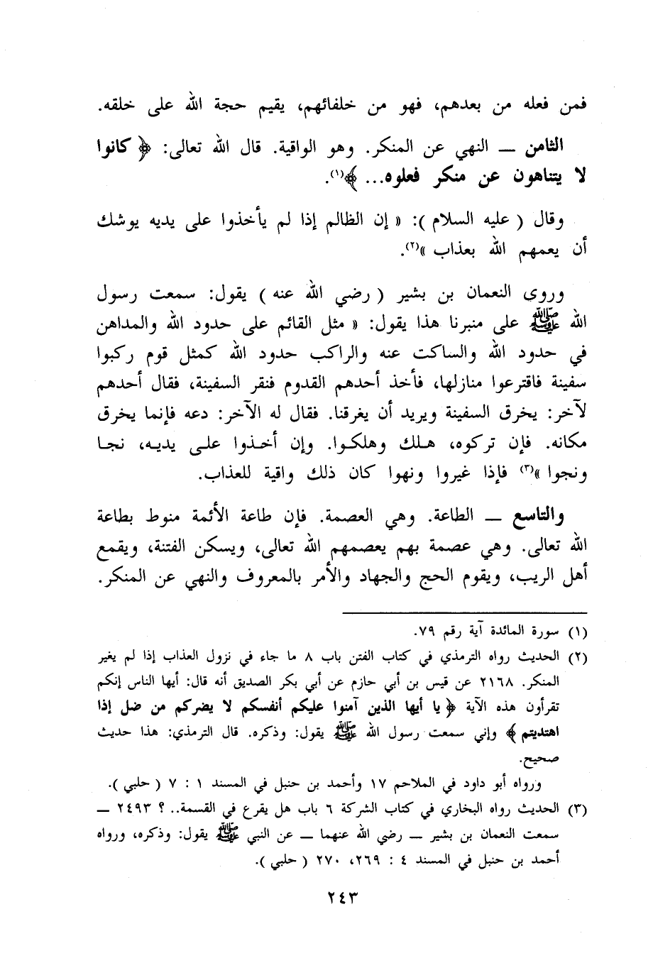 وروى النُّعْمَان بن بشير رَضِي الله عَنهُ يَقُول سَمِعت رَسُول الله صلى الله عَلَيْهِ وَسلم على منبرنا هَذَا يَقُول مثل الْقَائِم على حُدُود الله والمداهن فِي حُدُود الله والساكت عَنهُ والراكب حُدُود الله كَمثل قوم ركبُوا سفينة فاقترعوا منازلها فَأخذ أحدهم الْقدوم فَنقرَ السَّفِينَة فَقَالَ أحدهم لآخر يخرق السَّفِينَة وَيُرِيد أَن يغرقنا فَقَالَ لَهُ الآخر دَعه فَإِنَّمَا يخرق مَكَانَهُ فَإِن تَرَكُوهُ هلك وهلكوا وَإِن أخذُوا على يَدَيْهِ نجا ونجوا فَإِذا غيروا ونهوا كَانَ ذَلِك واقية للعذاب