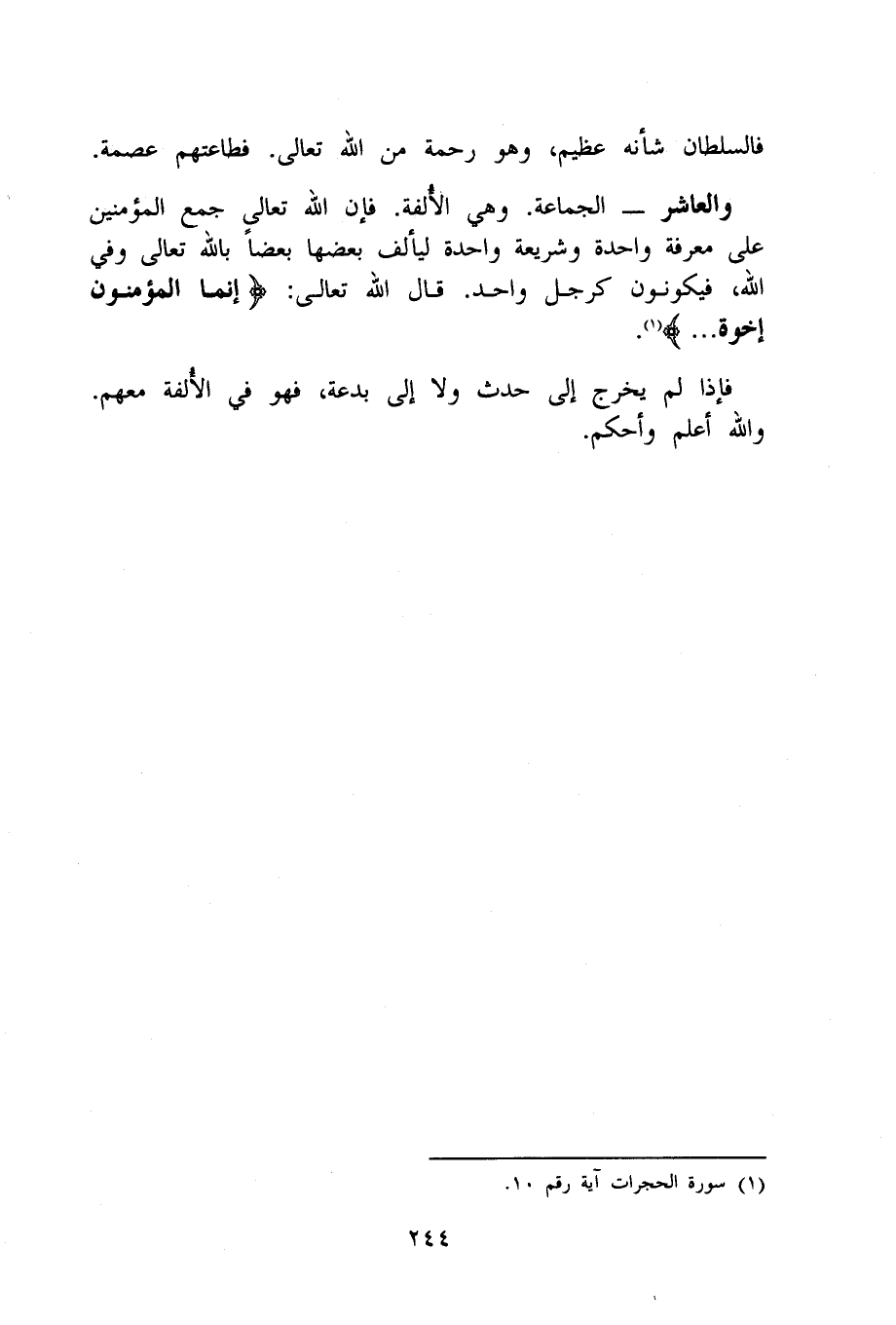 والعاشر الْجَمَاعَة وَهِي الألفة فَإِن الله تَعَالَى جمع الْمُؤمنِينَ على معرفَة وَاحِدَة وَشَرِيعَة وَاحِدَة ليألف بَعْضهَا بَعْضًا بِاللَّه تَعَالَى وَفِي الله فيكونون كَرجل وَاحِد قَالَ الله تَعَالَى {إِنَّمَا الْمُؤْمِنُونَ إخْوَة}
