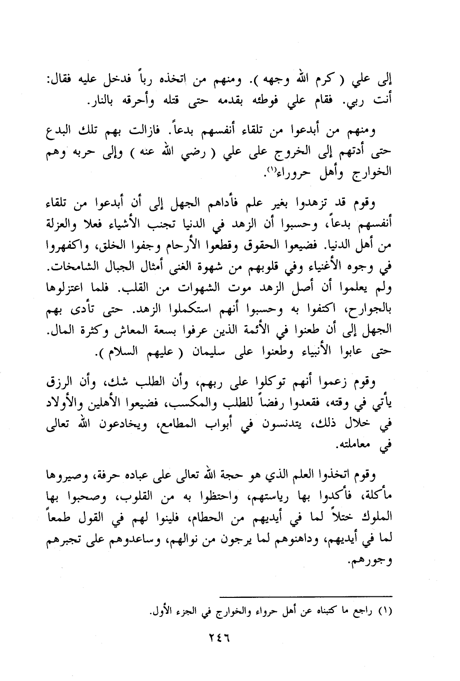 وَمِنْهُم من أبدعوا من تِلْقَاء أنفسهم بدعا فازالت بهم تِلْكَ الْبدع حَتَّى أدتهم إِلَى الْخُرُوج على عَليّ رَضِي الله عَنهُ وَإِلَى حربه وهم الْخَوَارِج وَأهل حروراء