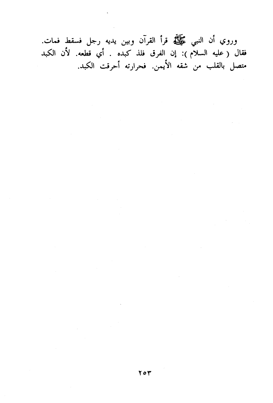 وَرُوِيَ أَن النَّبِي صلى الله عَلَيْهِ وَسلم قَرَأَ الْقُرْآن وَبَين يَدَيْهِ رجل فَسقط فَمَاتَ فَقَالَ صلى الله عَلَيْهِ وَسلم إِن الْفرق فلذ كبده أَي قطعه لِأَن الكبد مُتَّصِل بِالْقَلْبِ من شقَّه الْأَيْمن فحرارته أحرقت الكبد
